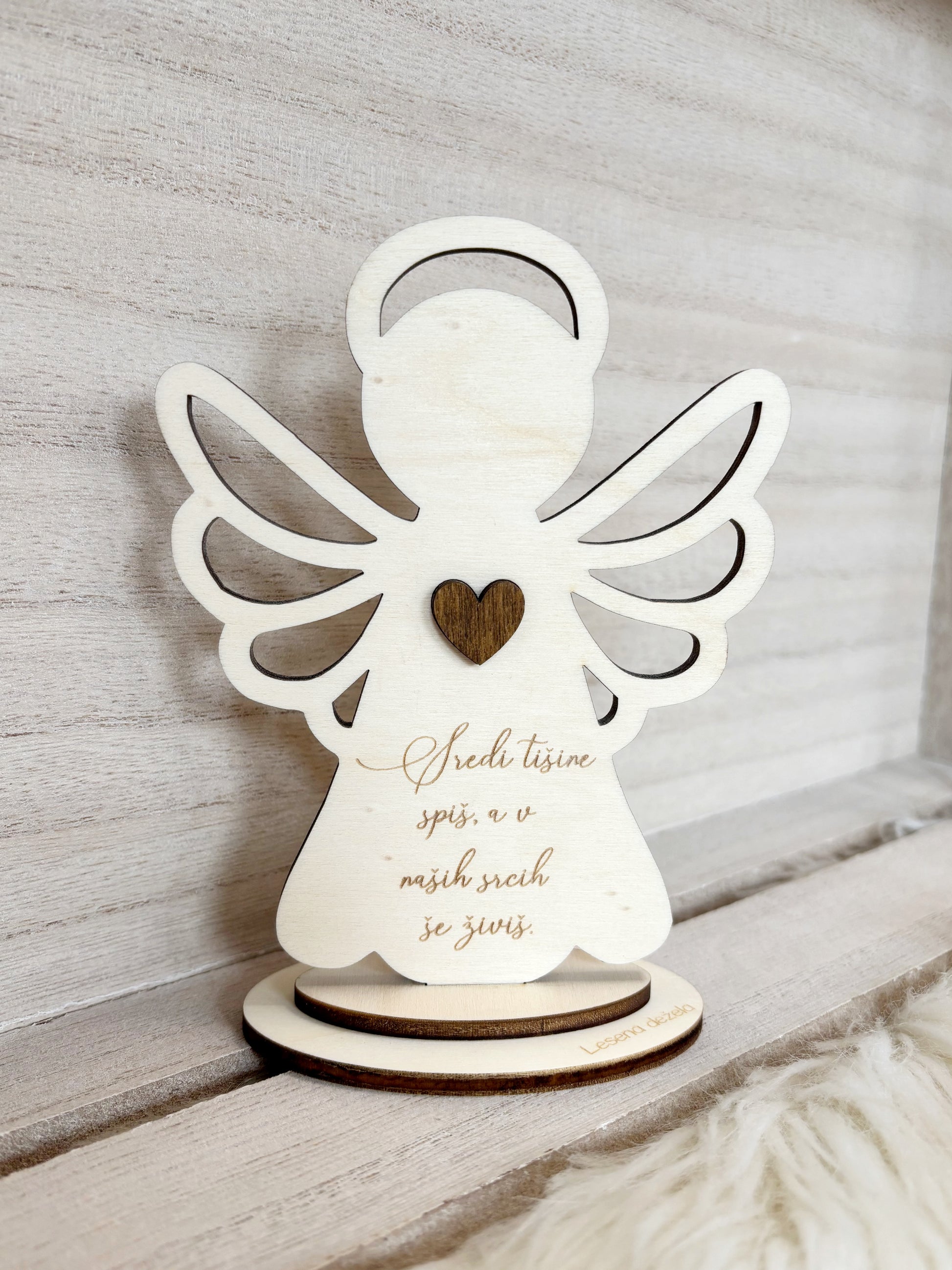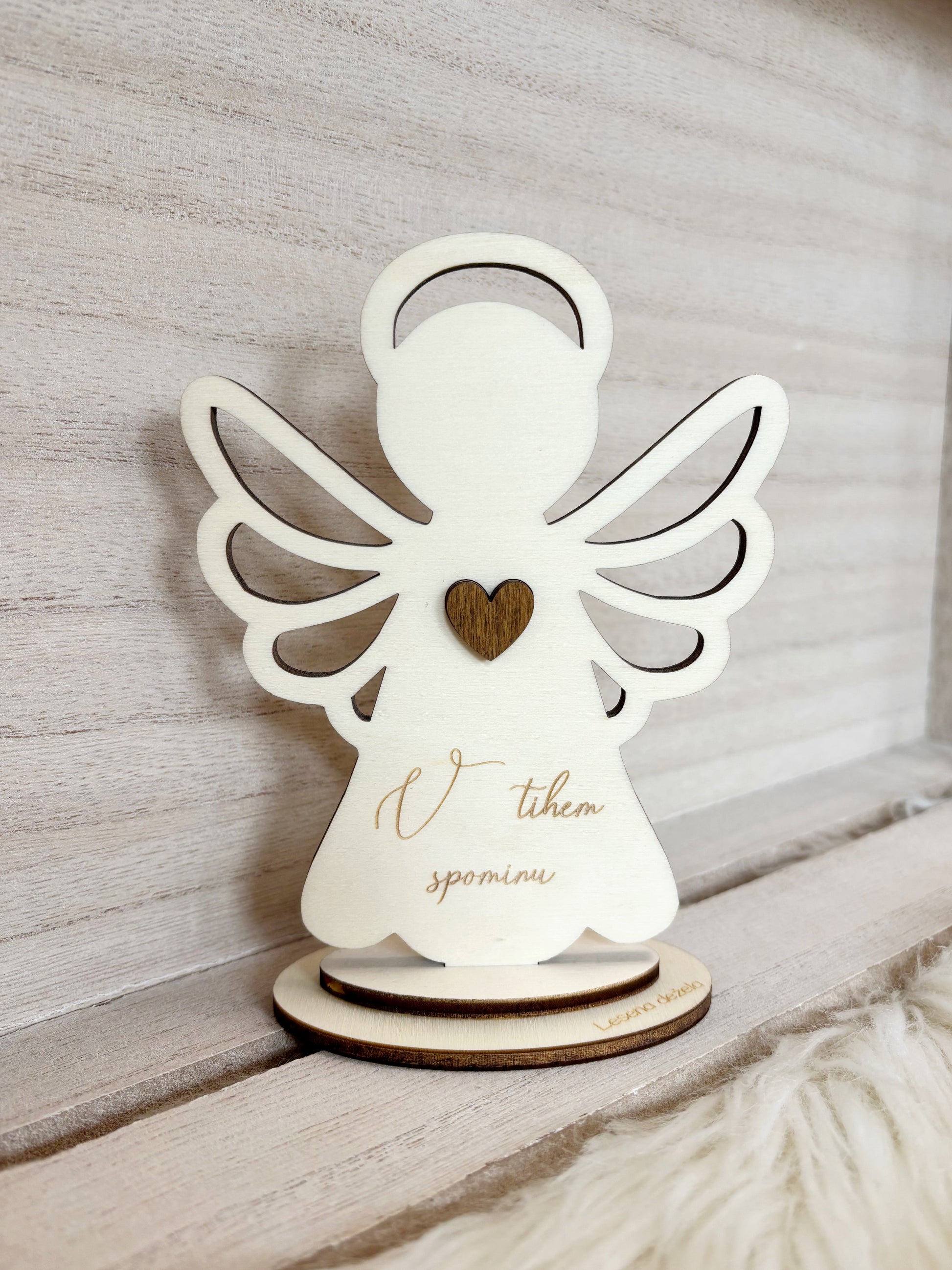 Angelček na podstavku s posvetilom je trajna alternativa klasičnim svečam. Brezplačno lahko dodam personaliziran napis po vaših željah. Izdelan je iz kakovostnega lesa in v primernih vremenskih pogojih zdrži vsaj 2–3 mesece ali dlje.