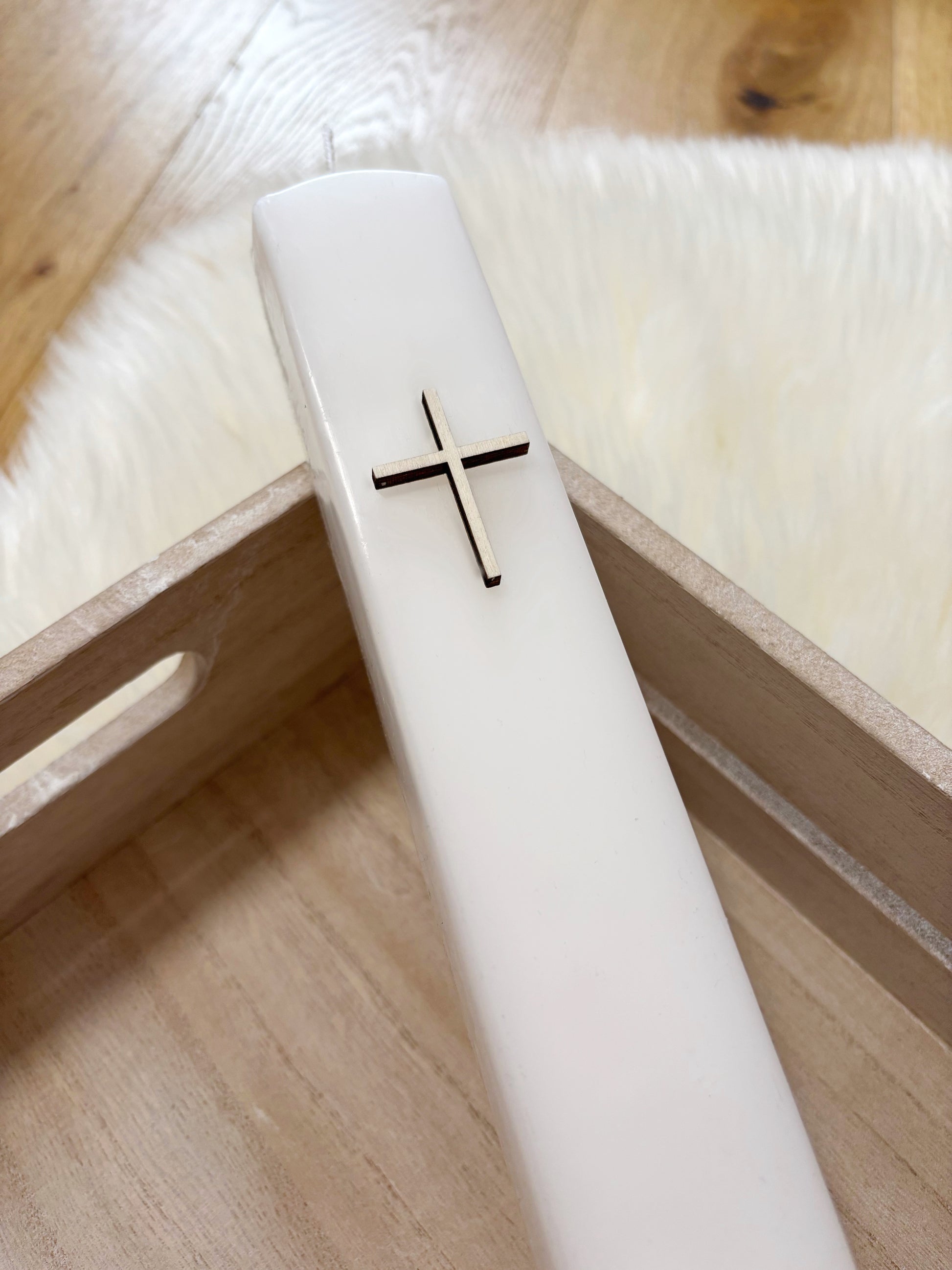 Preprosta in elegantna krstna sveča kvadratne oblike. Preprosto okrašena z lesenimi detajli in pentljico, ki ji doda nežnost. Primerna za deklice in dečke, saj lahko barvo pentljice izberete sami.