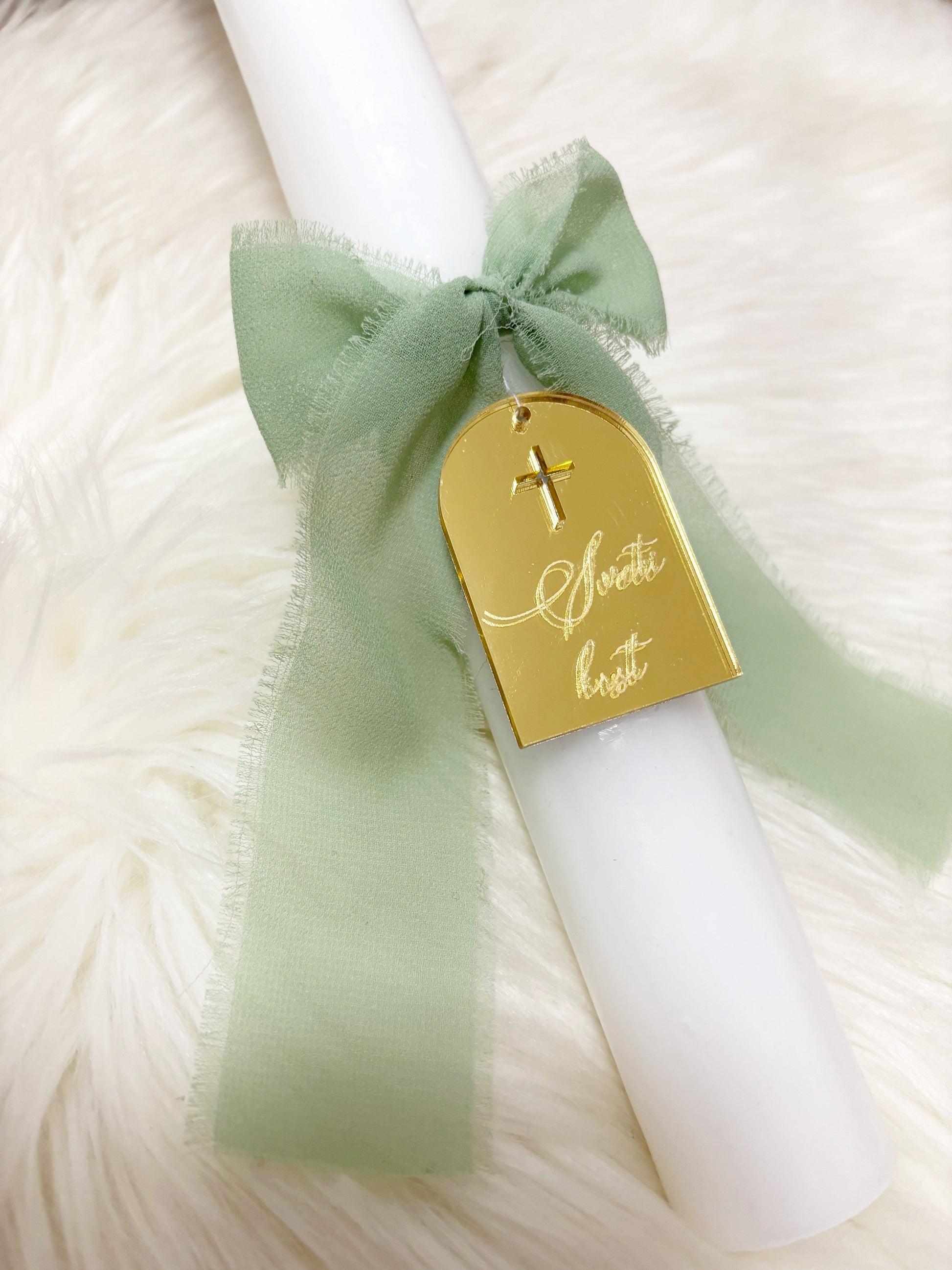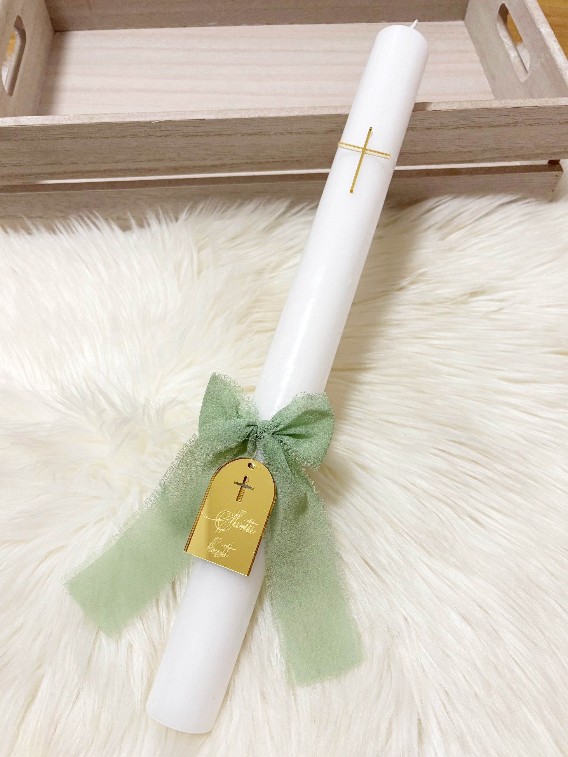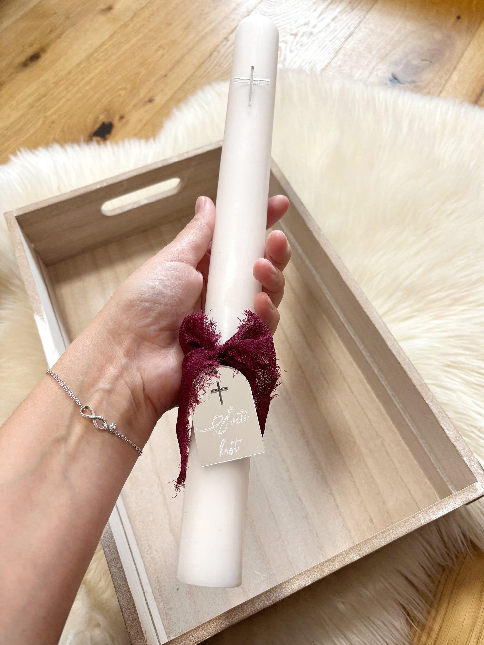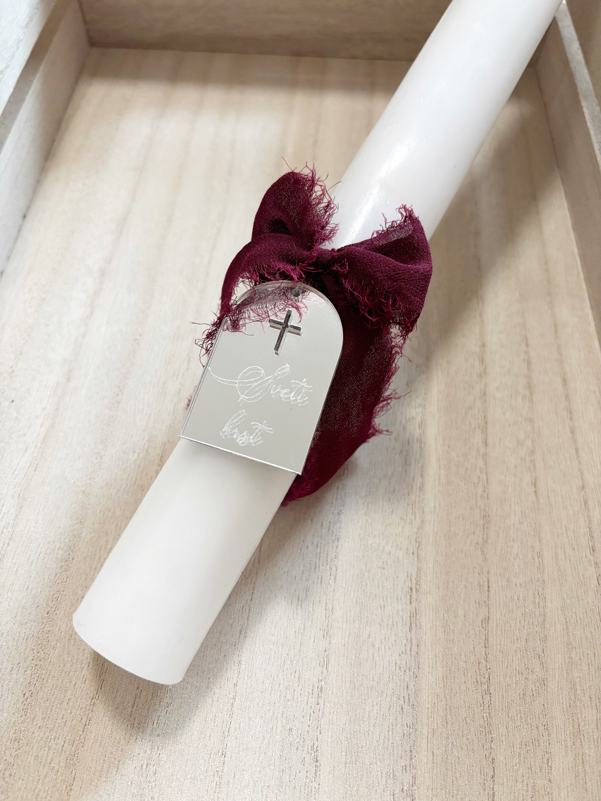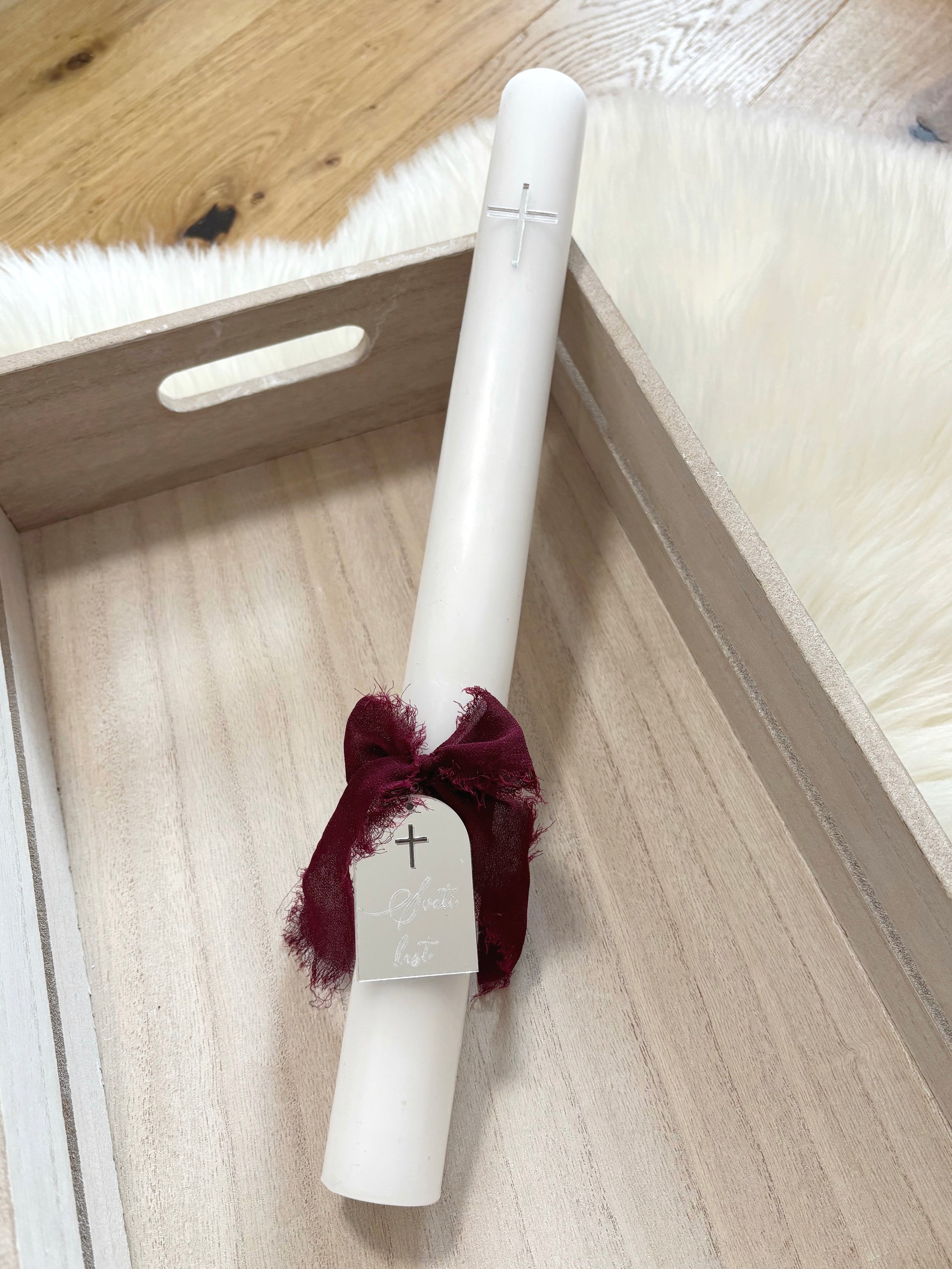Okrogla krstna sveča s križcem ter tablico iz pleksija z napisom Sveti krst. S preprostim, a sodobnim videzom doda praznovanju piko na i. Izbirate lahko med različnimi barvami pleksija, da se popolnoma ujame z vašim stilom krsta. K sveči lahko dodate tudi personalizirano leseno škatlo, izdelano po vaših željah.