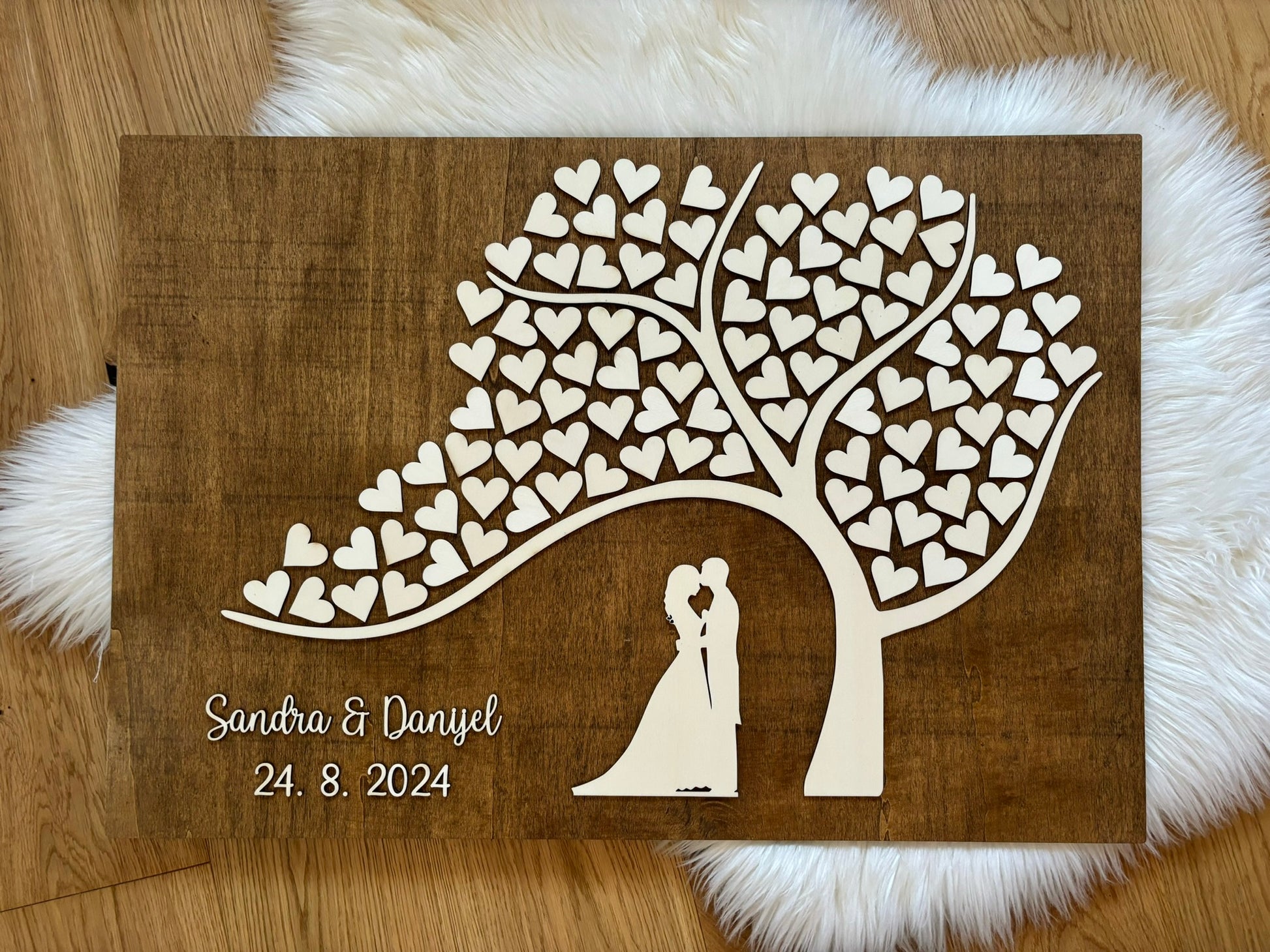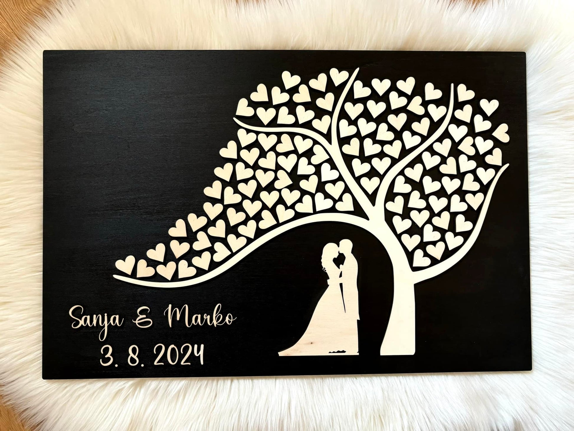 Lesena tabla gostov s srčki je popoln dodatek za vajin poročni dan, kamor se bodo svatje podpisali za spomin. Izdelana je iz visokokakovostnega lesa, na voljo v rjavi ali črni barvi. Ta unikatna tabla ne služi le kot dekoracija, temveč postane tudi trajen spomin na vajin poseben dan.
