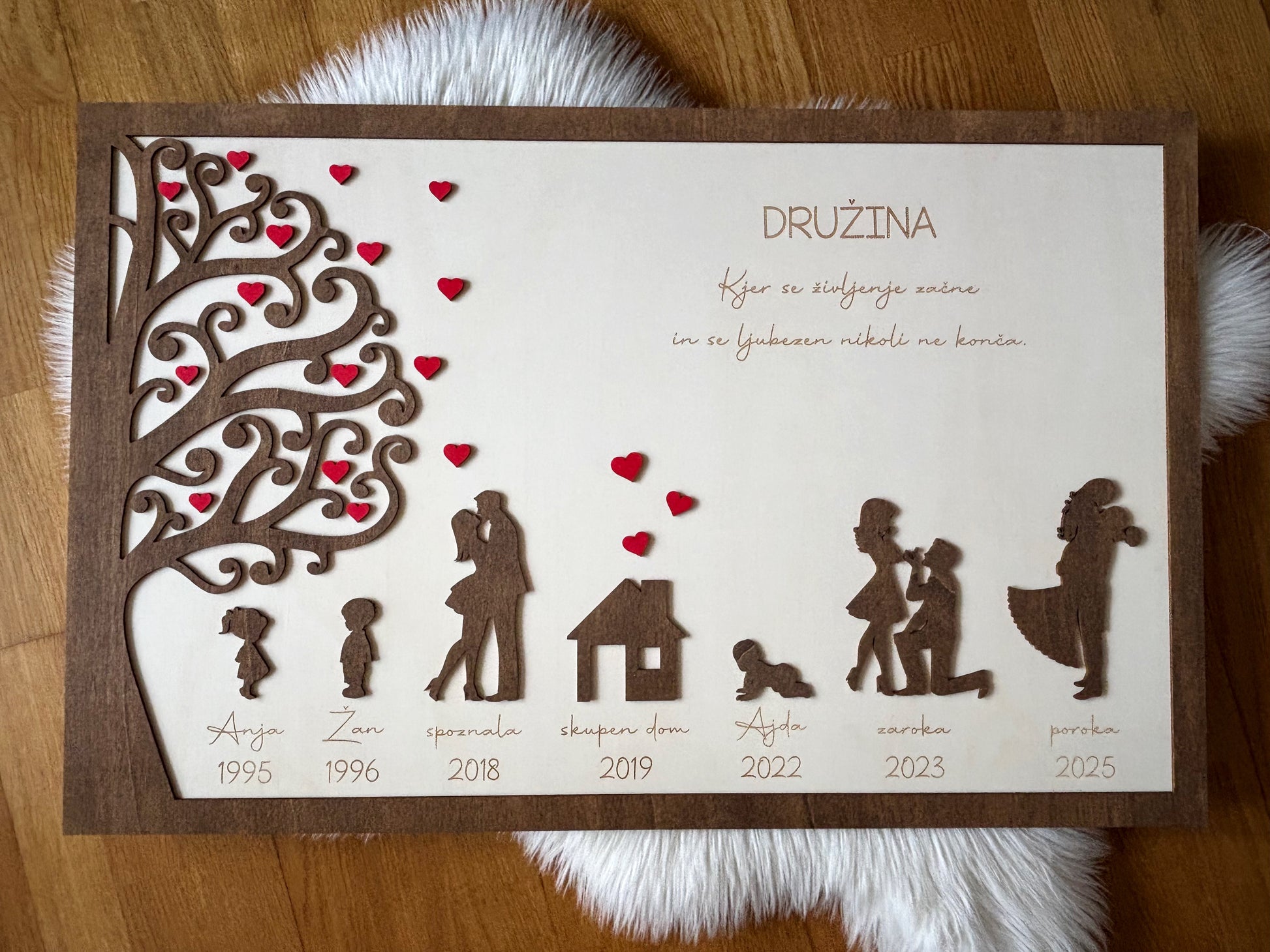 Lesena tabla Najina zgodba na enem mestu združi vse pomembne prelomnice, od rojstva do poroke. Čudovit spomin, ki v toplini lesa pripoveduje zgodbo skupne poti mladoporočencev.