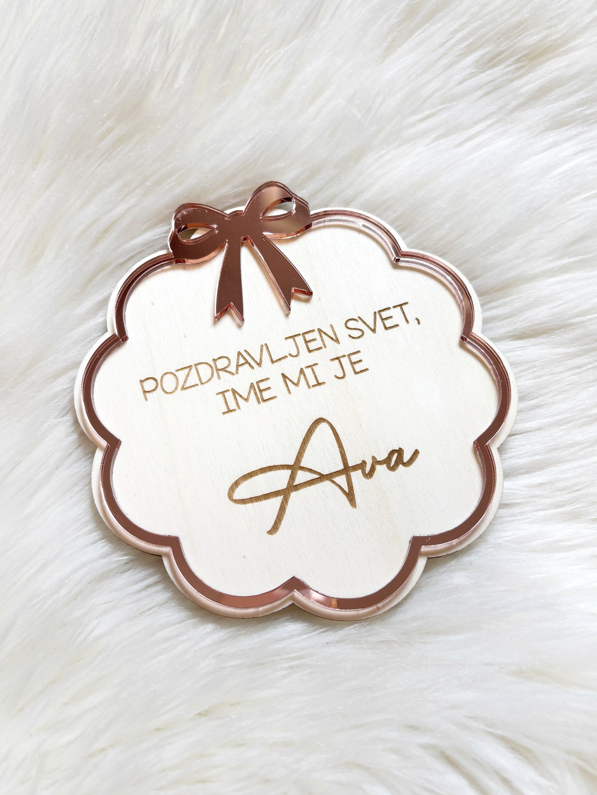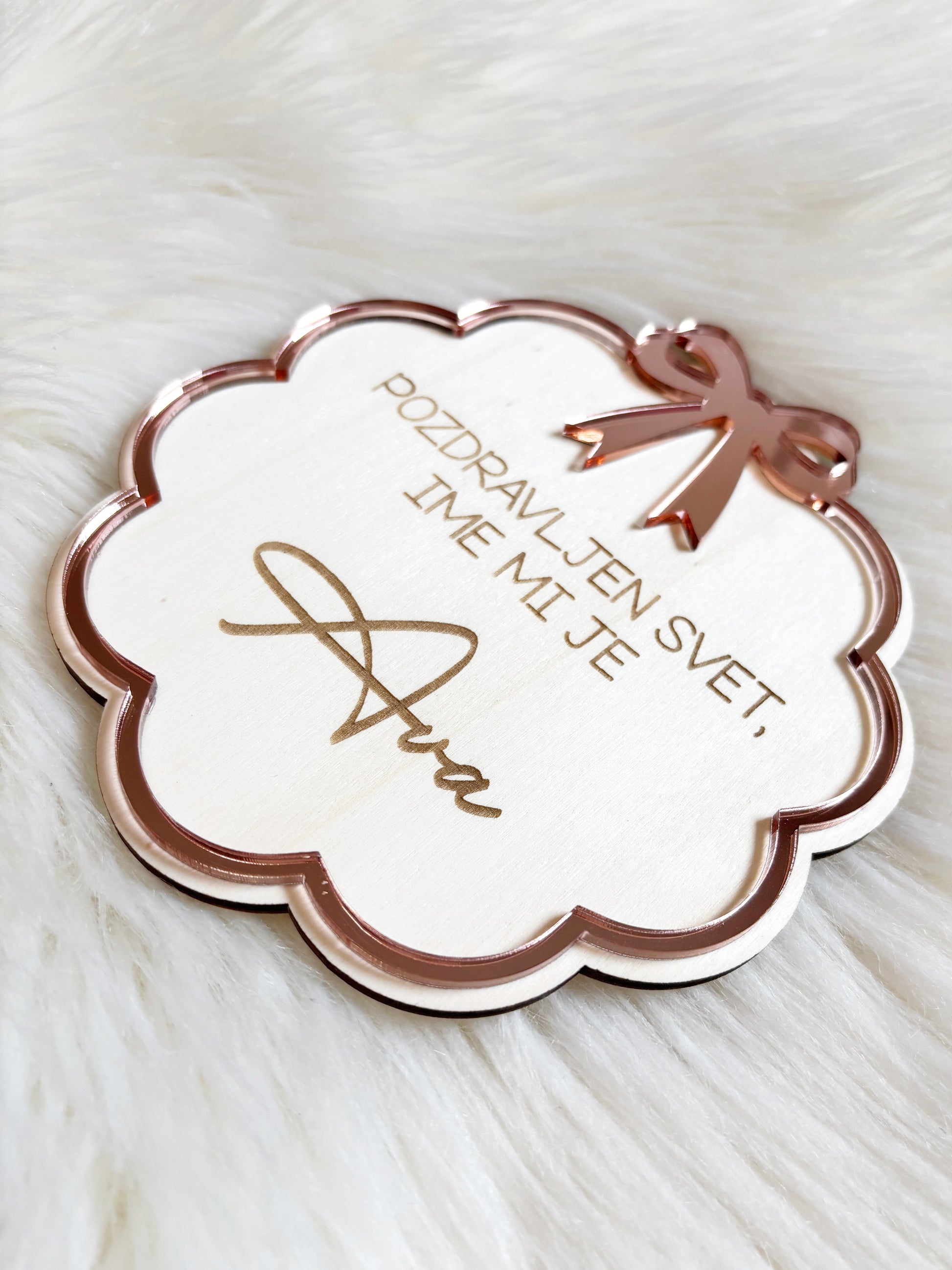 Oznanitvena kartica iz naravnega topolovega lesa, dopolnjena z elegantnim pleksi steklom in nežno pentljico, je čudovit dodatek za prve fotografije vašega dojenčka ob rojstvu. Barvo pleksi stekla lahko izberete po želji, da se popolnoma ujema z vašim stilom.