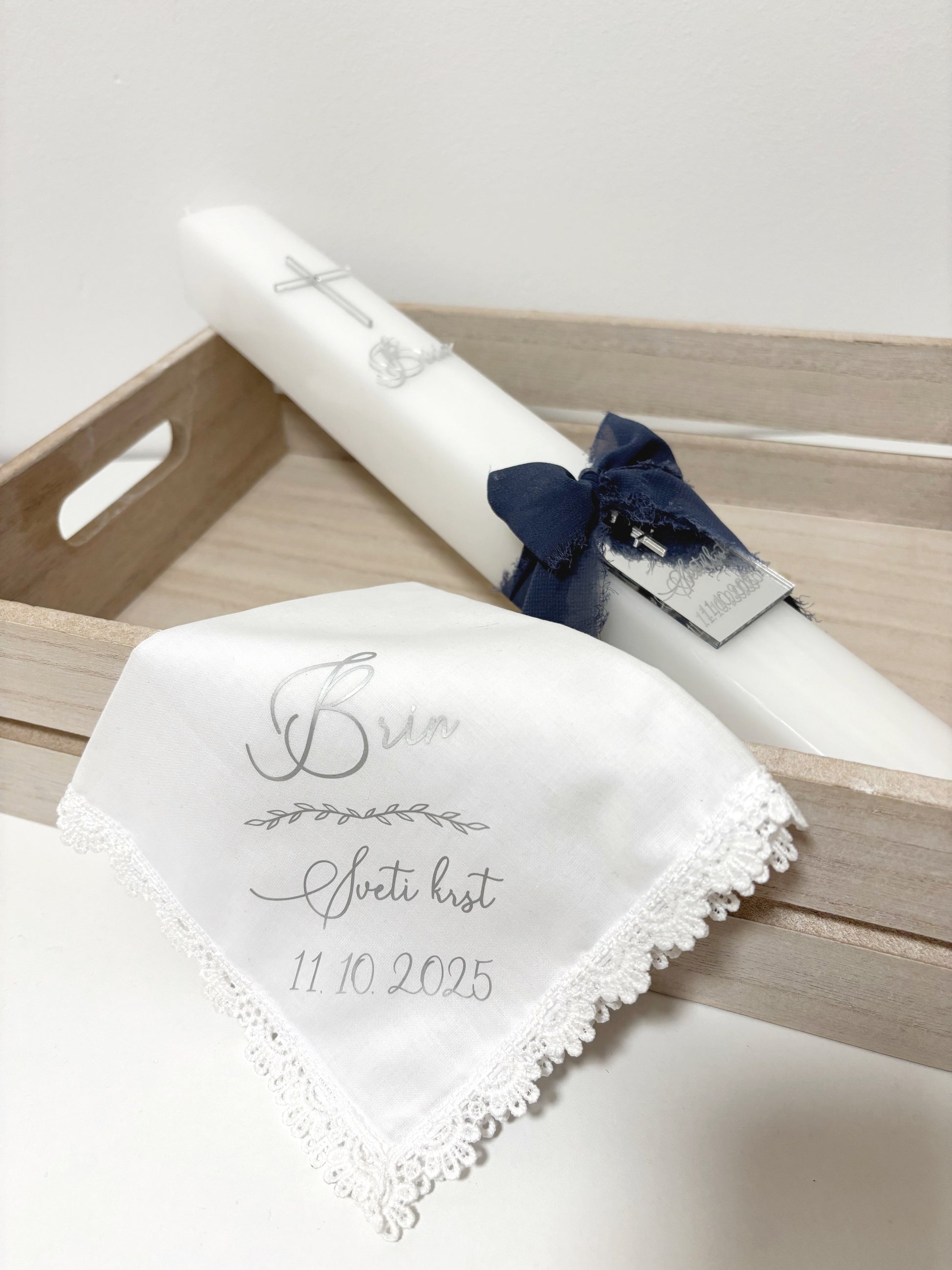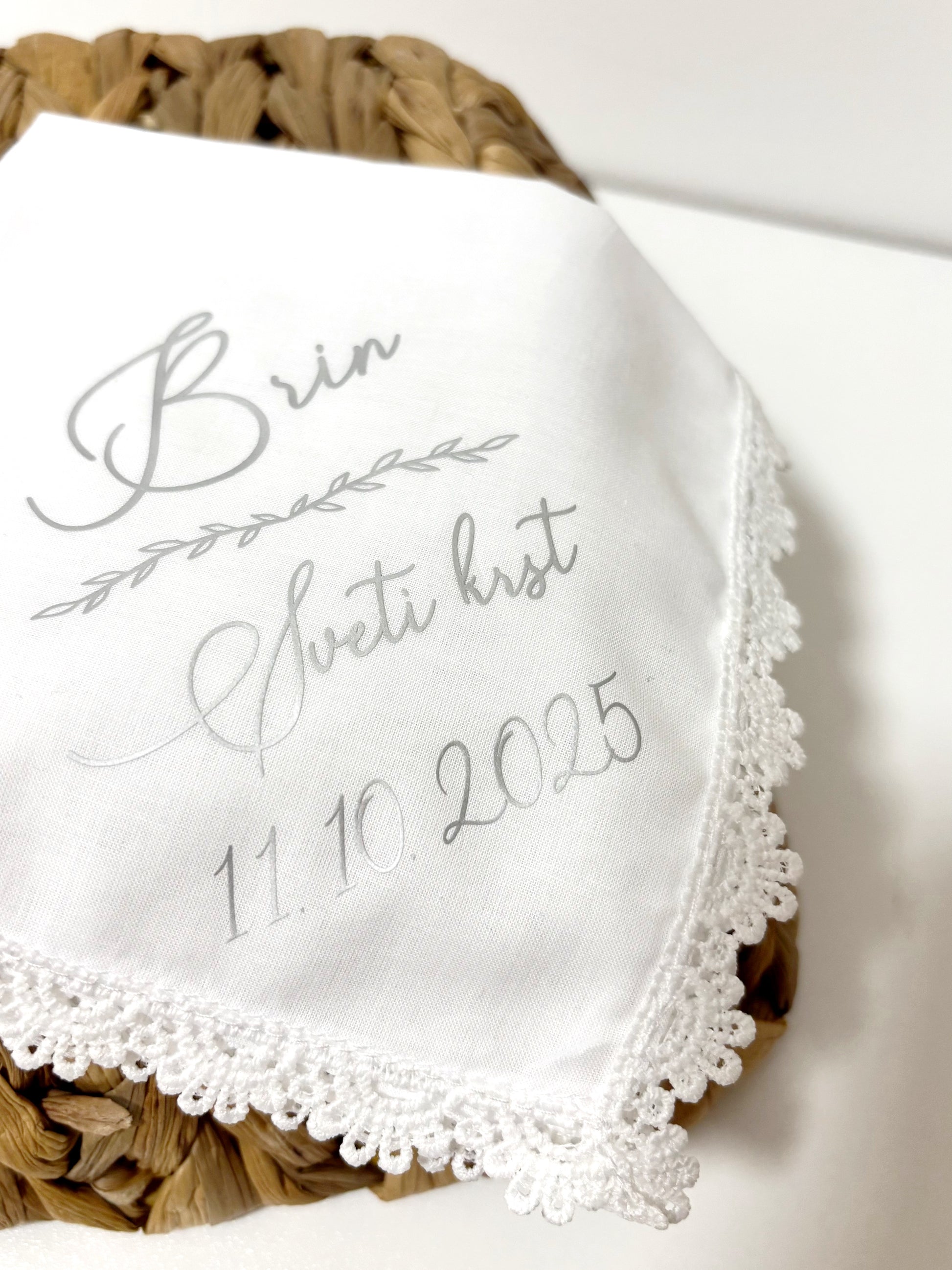 Krstni prtiček simbolizira belo oblačilo, ki ob krstu predstavlja čistost, nedolžnost in nov začetek. Vsak prtiček je ročno sešit in dopolnjen z imenom ter datumom krsta v zlati ali srebrni barvi. Nežen spomin na ta poseben dan.