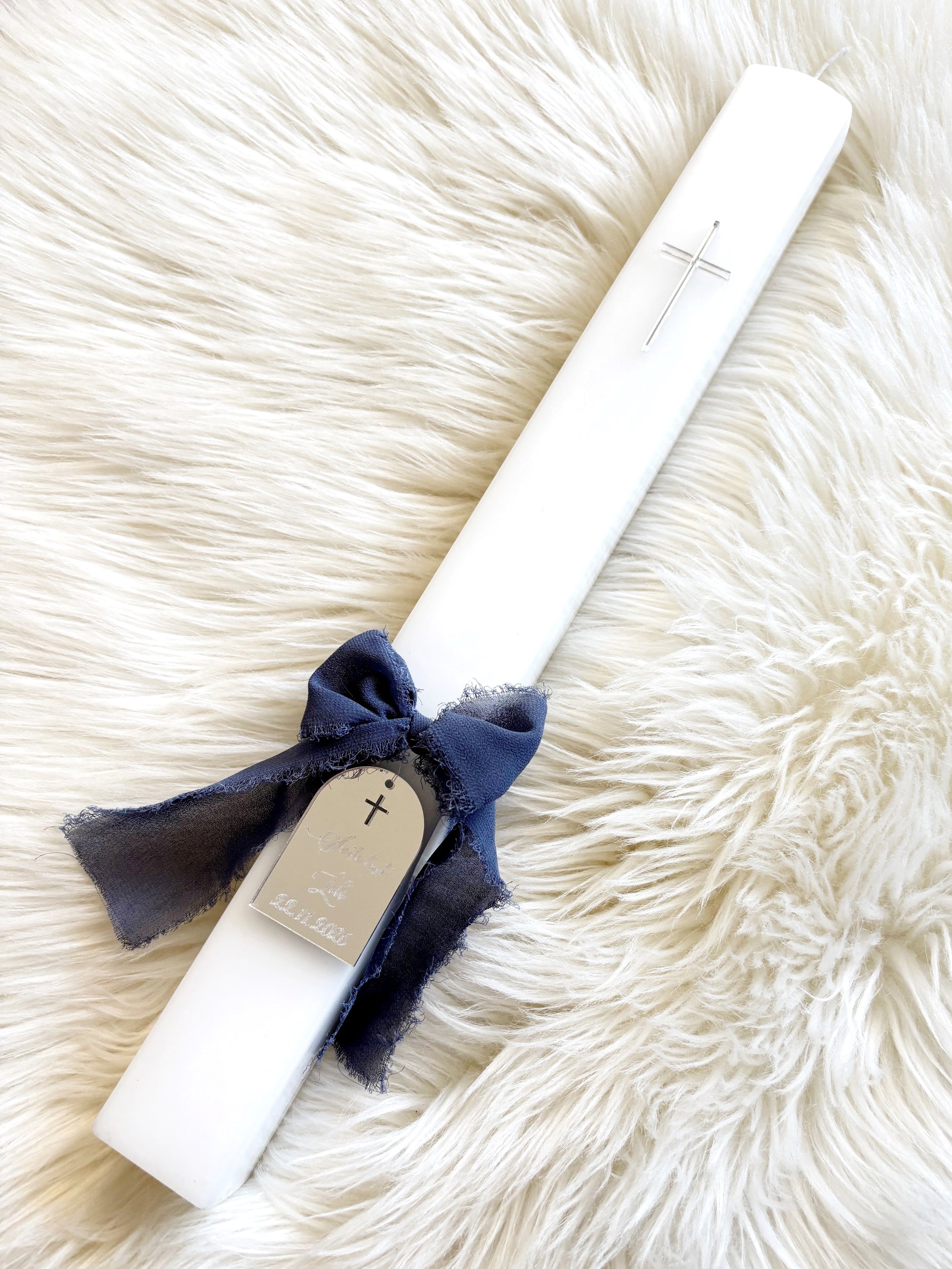 Visoka ter elegantna krstna sveča kvadratne oblike. Preprosto okrašena z akrilnimi detajli in pentljico, ki ji doda nežnost. Primerna za deklice in dečke, saj lahko barvo pentljice izberete sami.