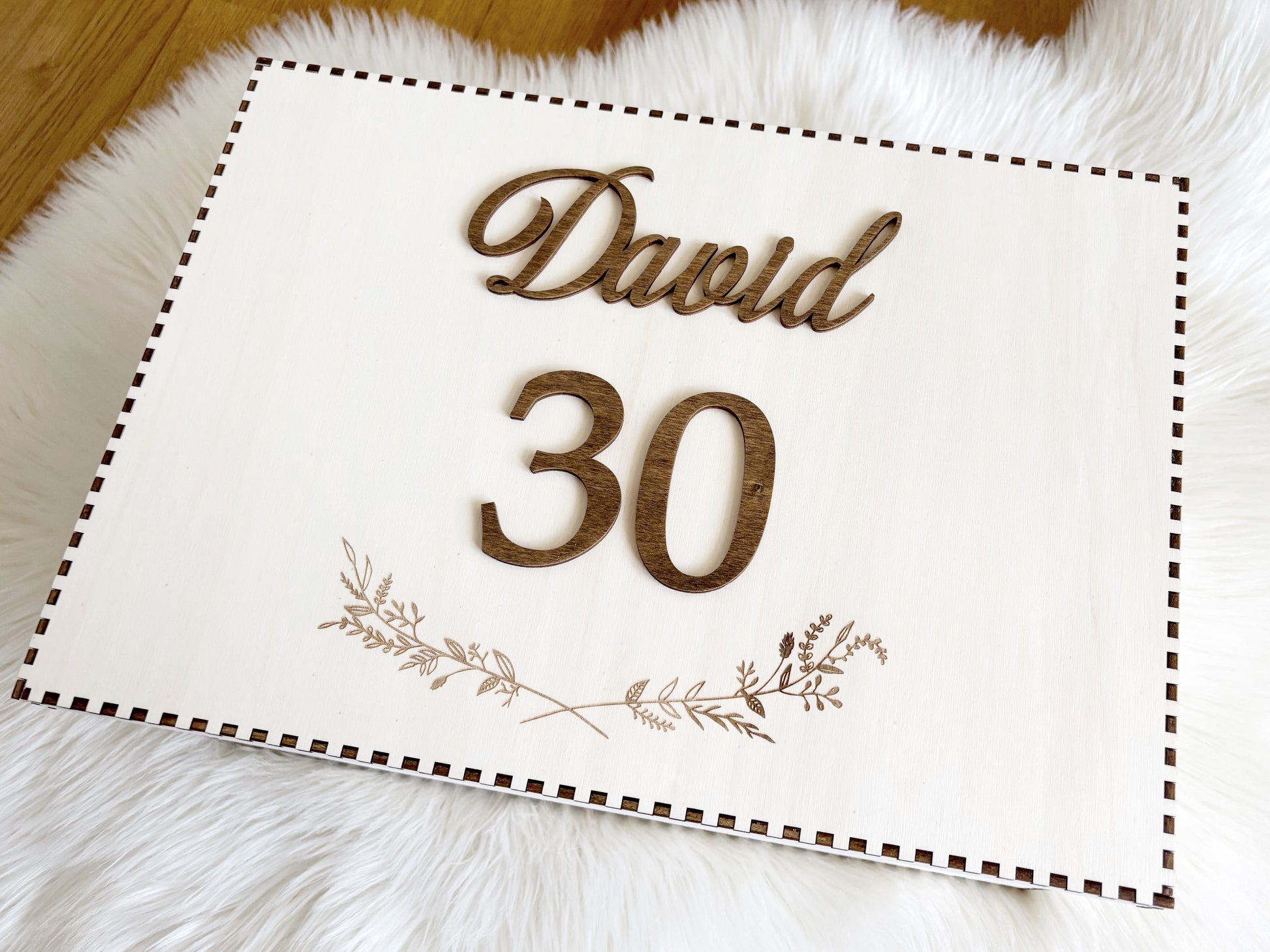 Lesena škatlica personalizirana z imenom ter številom na sprednji strani je popolna za rojstne dneve ter druge posebne priložnosti. Gravirane vejice dodajo nežno dekoracijo in popestrijo njen celoten videz.