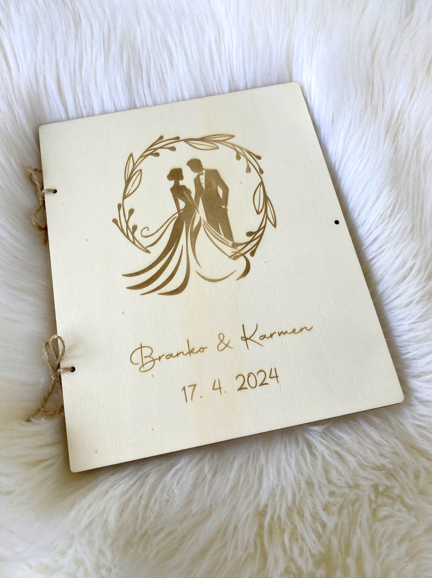Poročna lesena vizitka je elegantna izbira za darilo ob poroki ali kot dodatek k voščilu mladoporočencema. V notranjosti se nahaja kuverta za vaše sporočilo ali denar, na drugi strani pa je prostor za posvetilo in podpise.