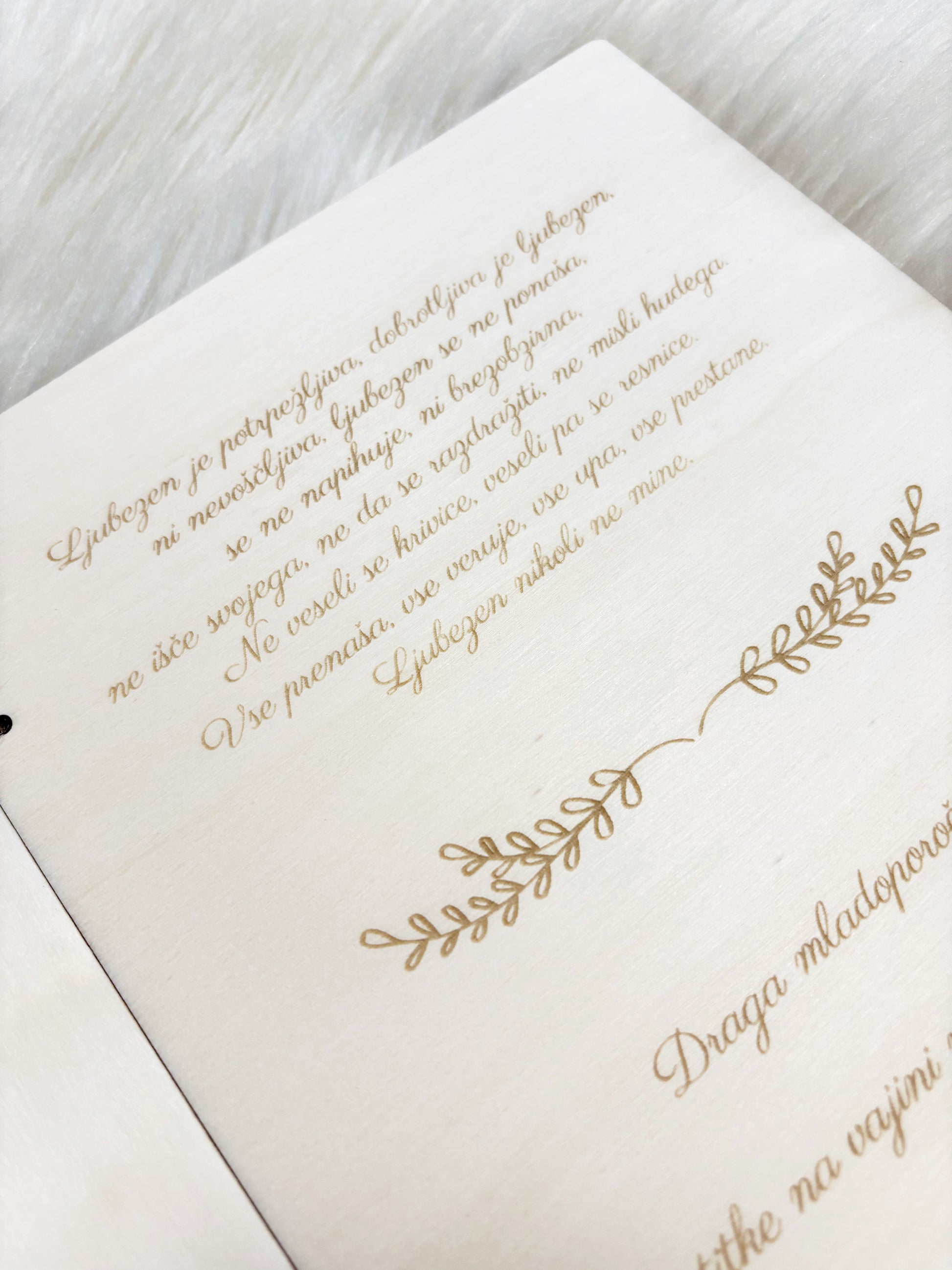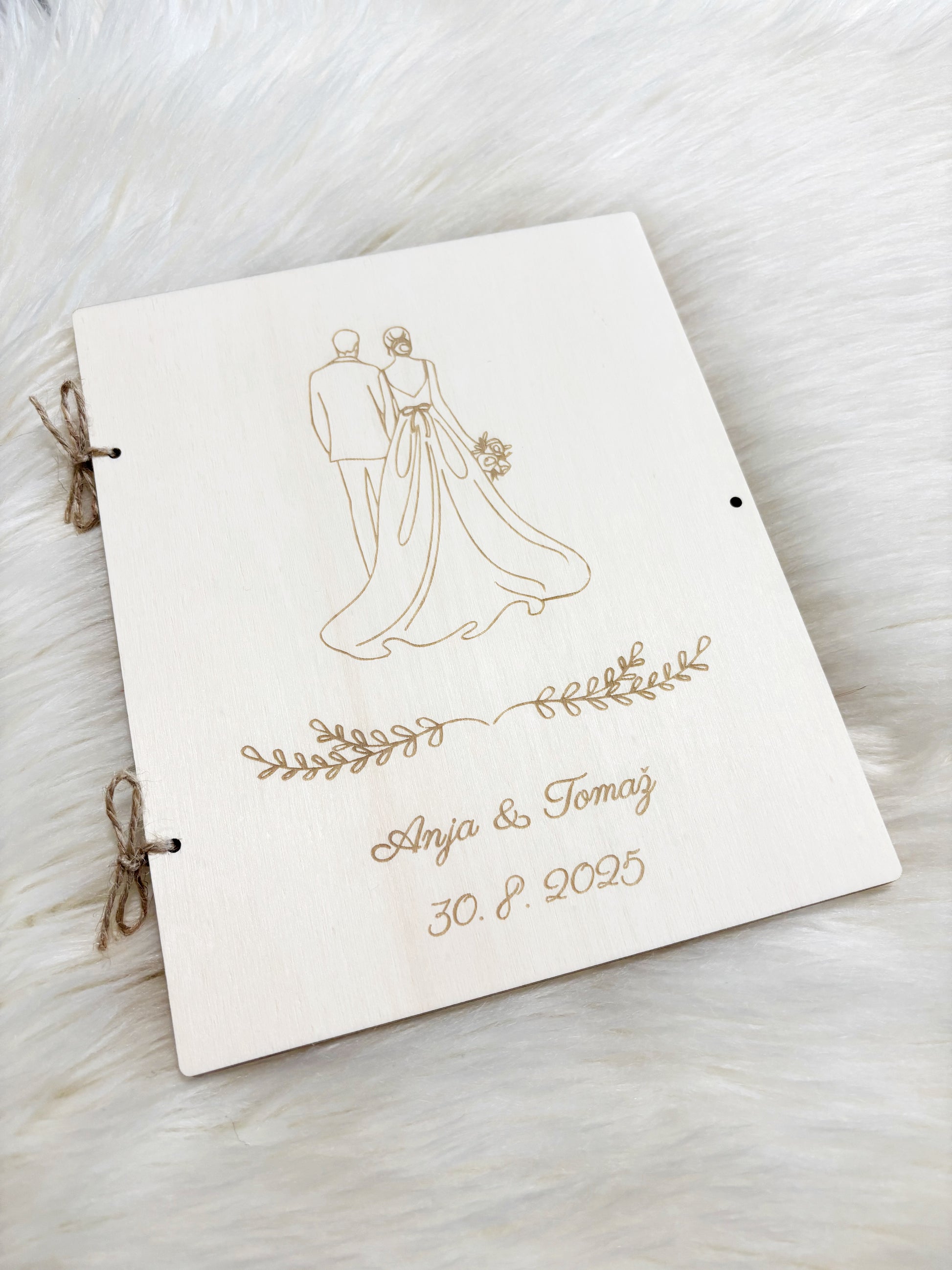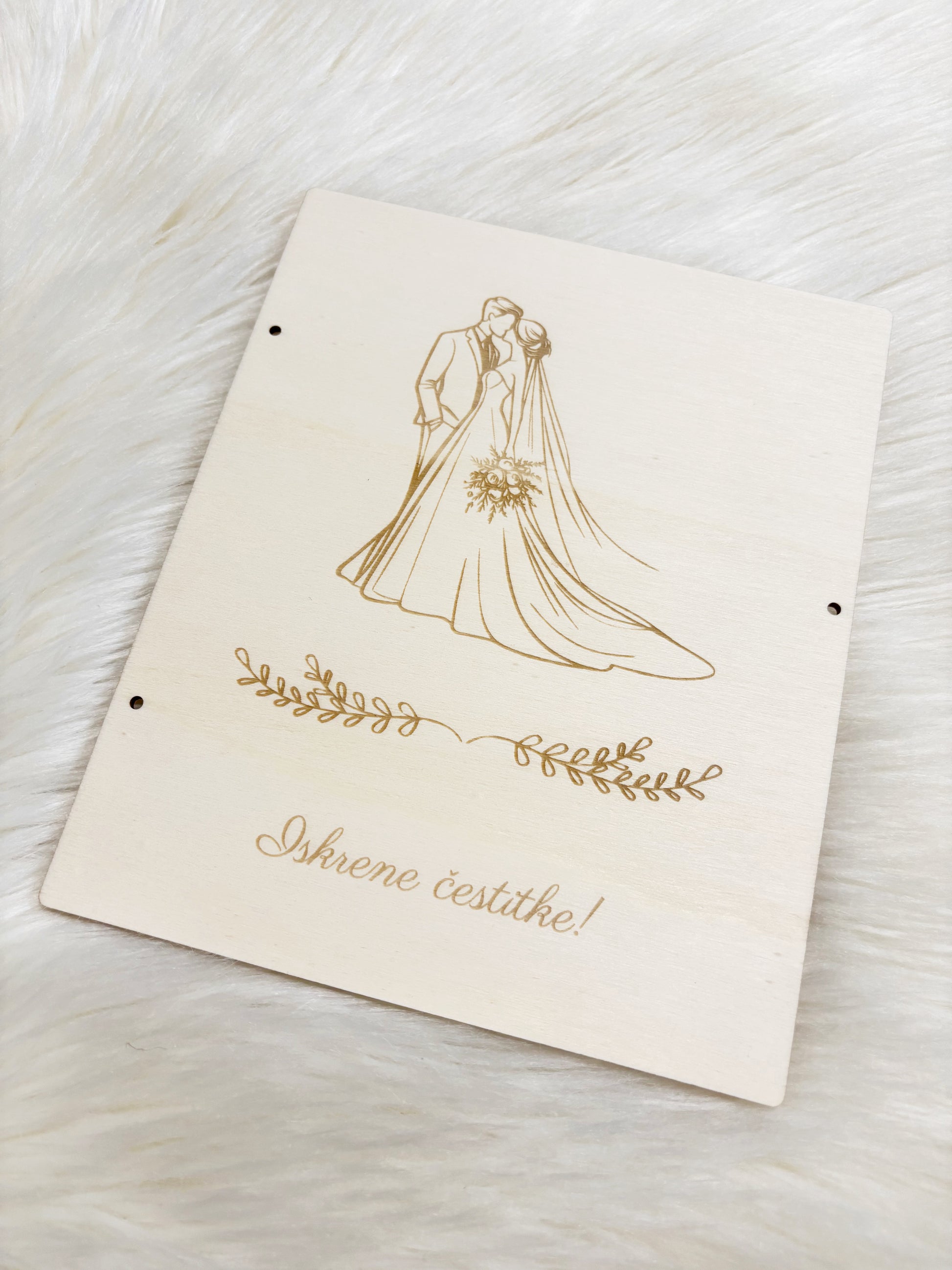 Poročna lesena vizitka je elegantna izbira za darilo ob poroki ali kot dodatek k voščilu mladoporočencema. V notranjosti se nahaja kuverta za vaše sporočilo ali denar, na drugi strani pa je prostor za posvetilo in podpise.