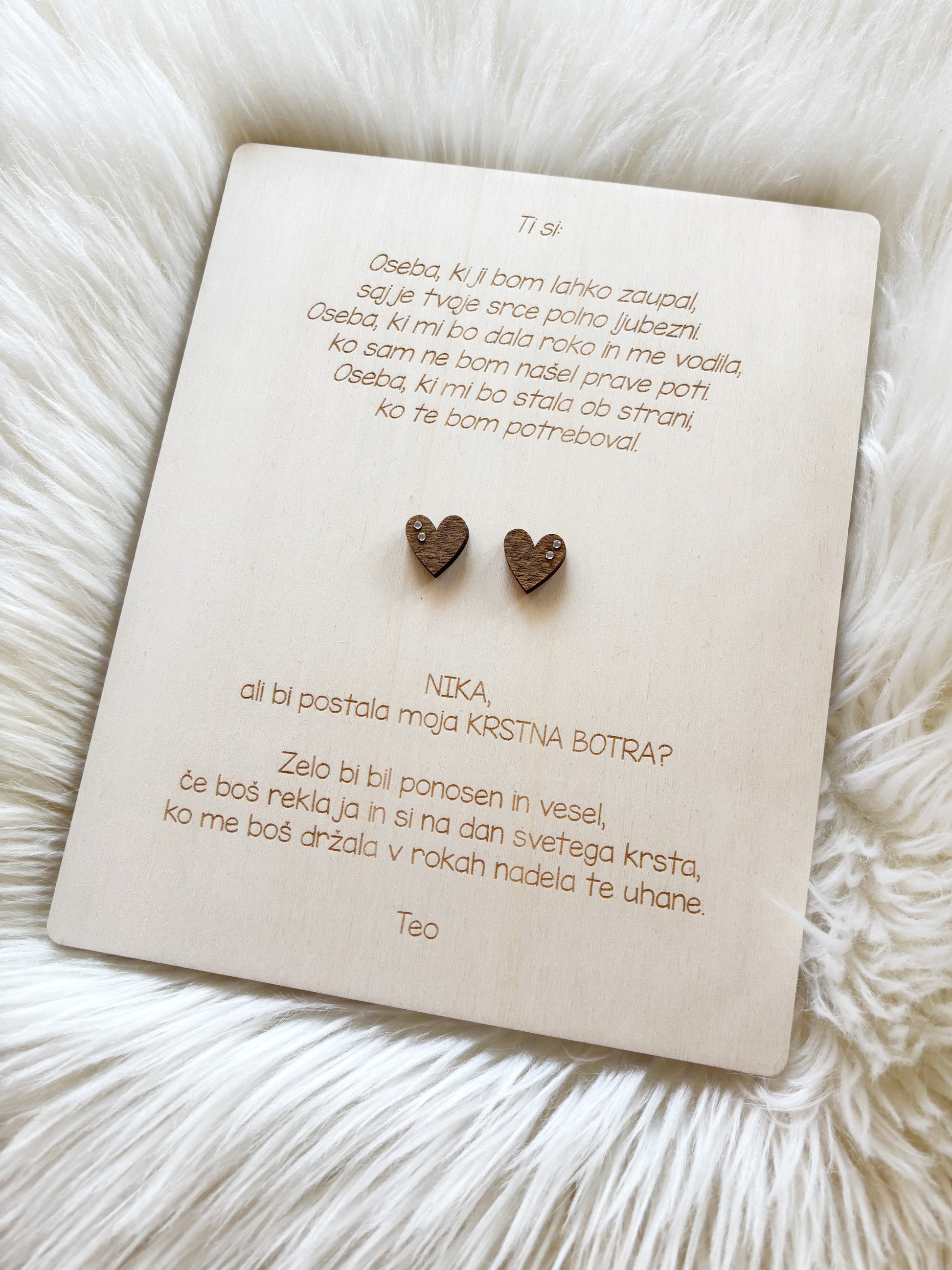 Lesena prošnja za botro z lesenimi uhani, ki navduši in jo naredi še bolj posebno. Lep način, da bodočo botro presenetite in jo povabite k pomembni življenjski vlogi.