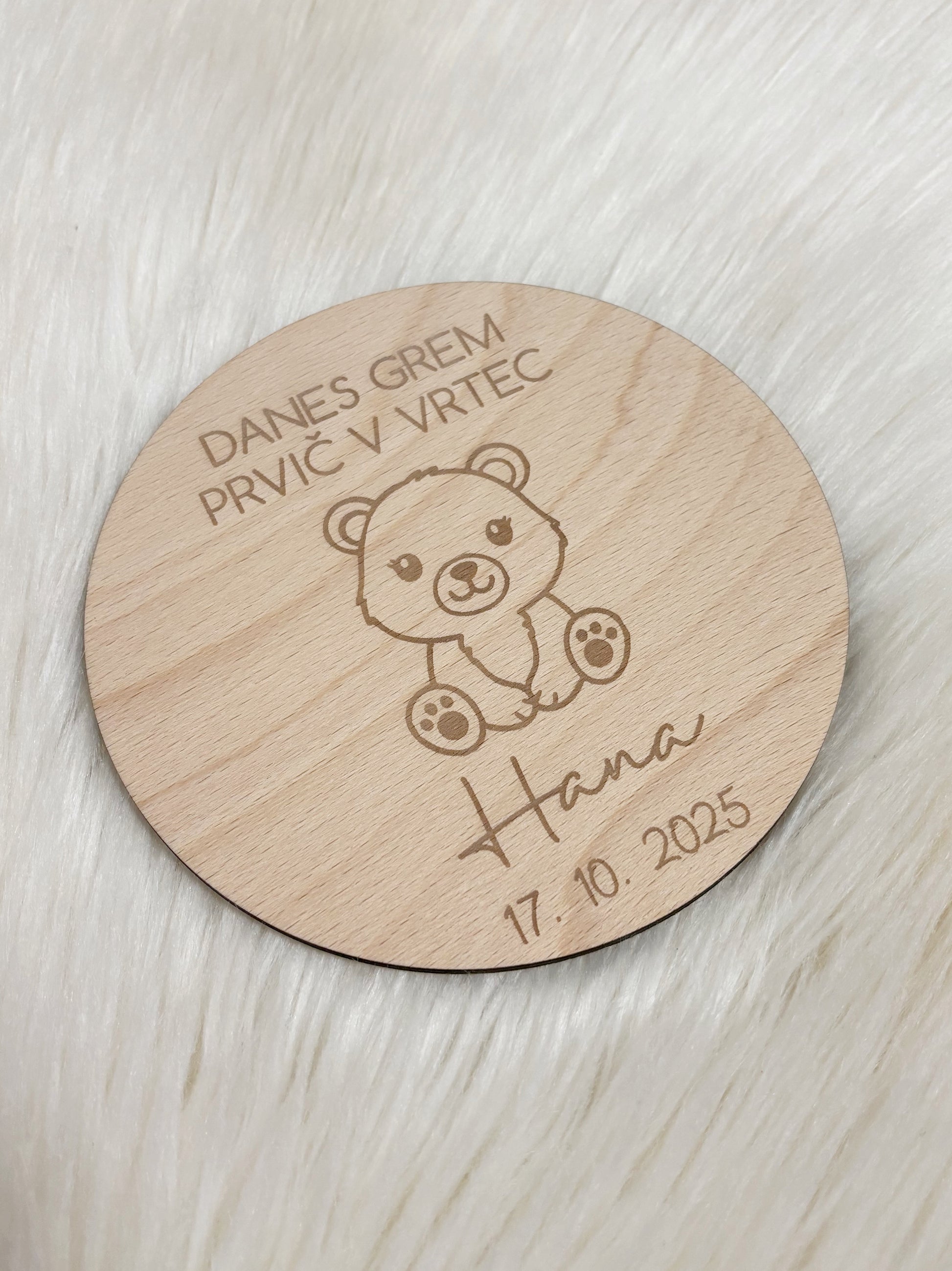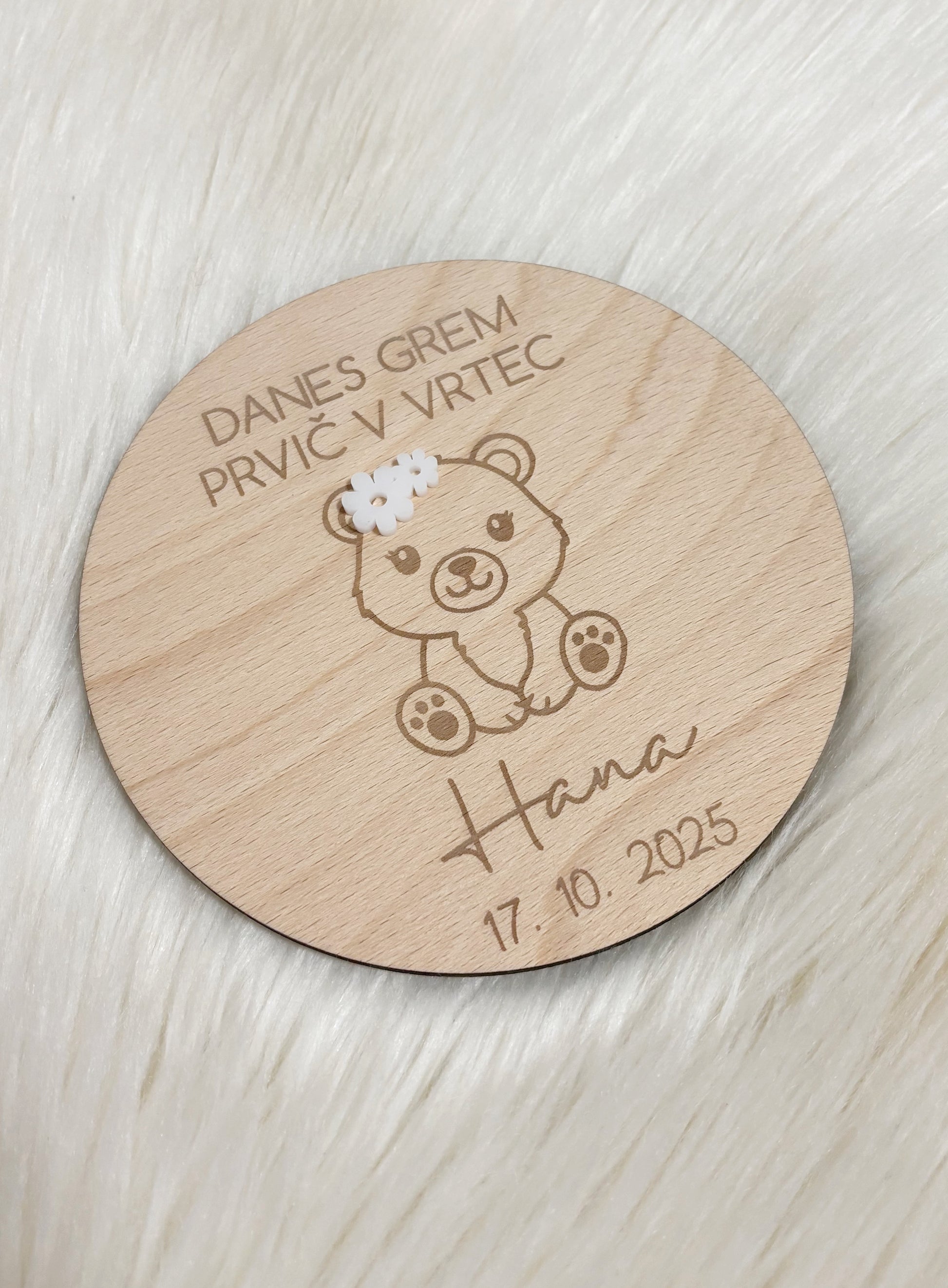 Lesena tablica za prvi dan v vrtcu je čudovit izdelek, s katerim lahko vašega otroka fotografirate na njegov pomemben dan, nato pa jo shranite za spomin. Okrašena je z ljubkim medvedkom, zraven pa se lahko odločite za pleksi rožico ali izberete brez, izbira je vaša.