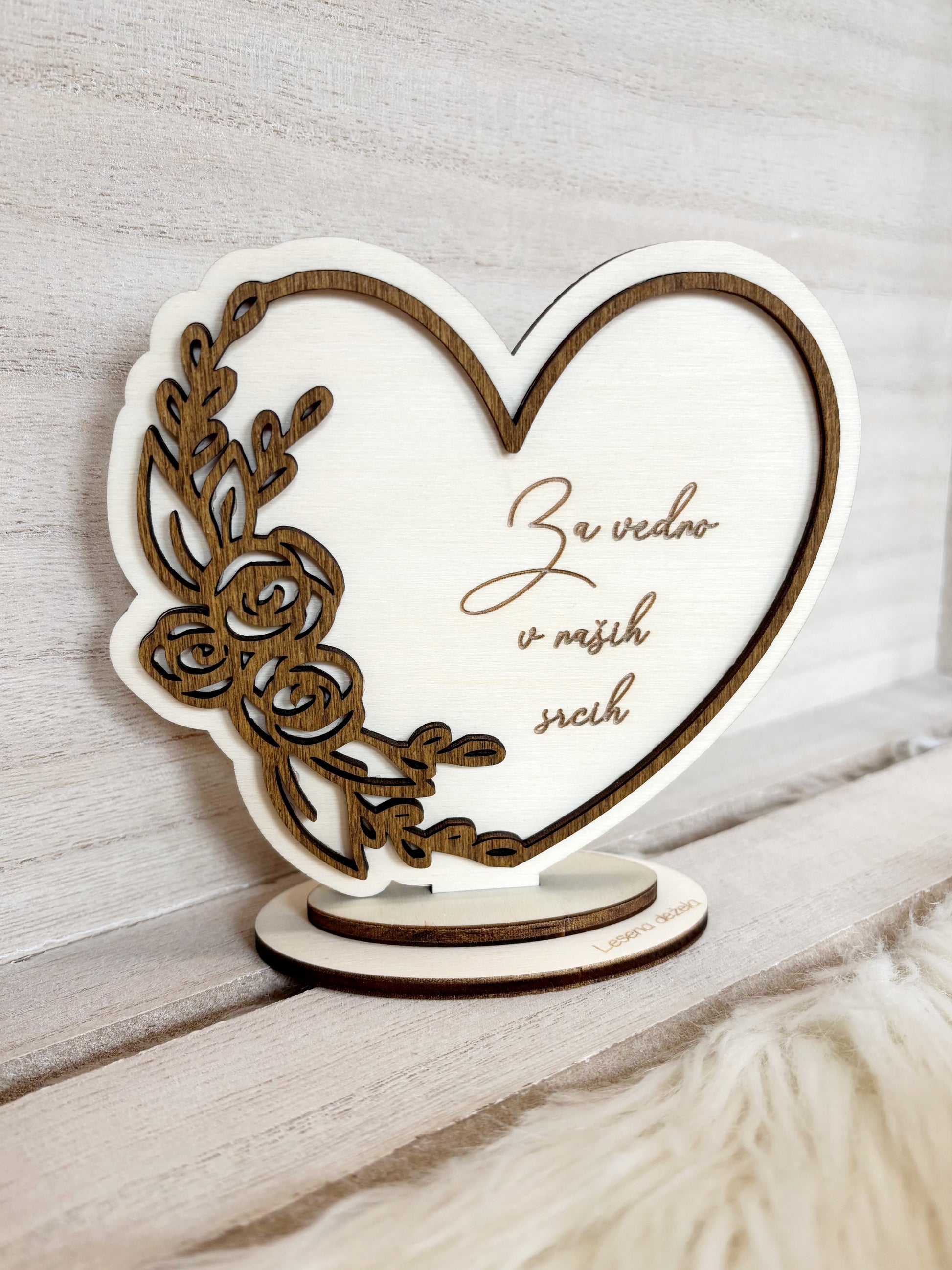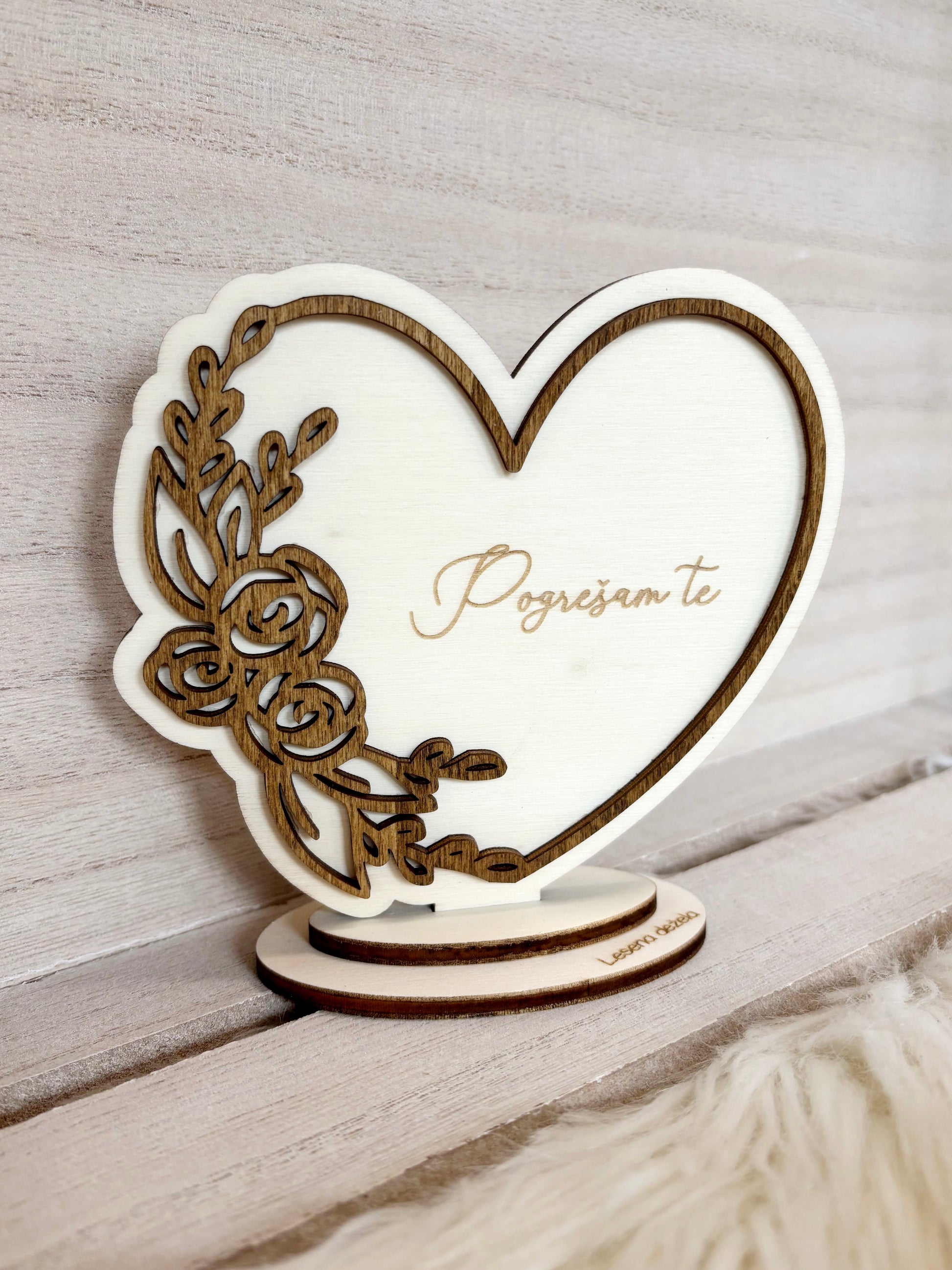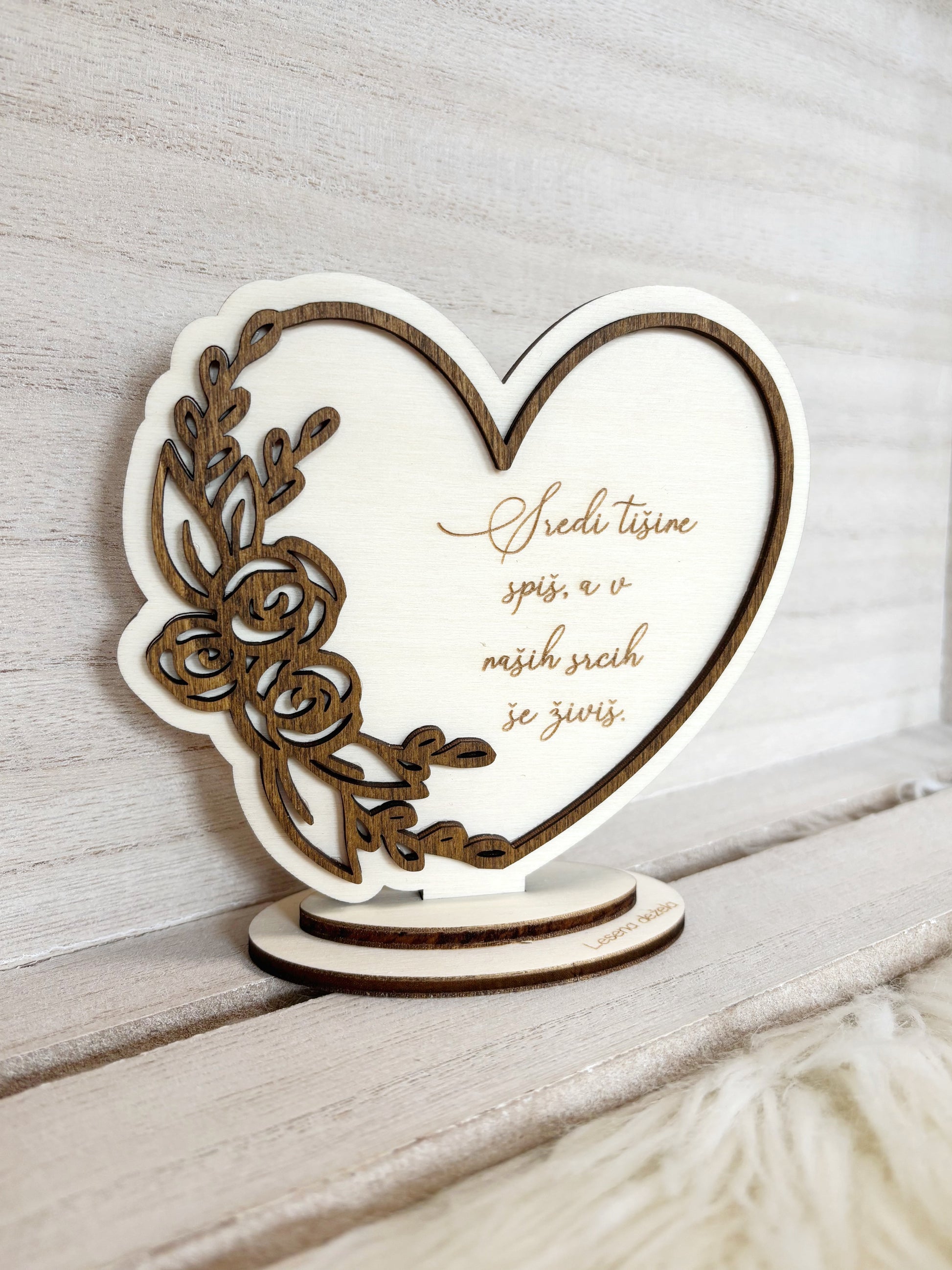 Leseni srček na podstavku z rjavim okvirjem in posvetilom je čudovit spominski okras za vaše ljubljene. Iz kakovostnega lesa, v primernih vremenskih pogojih ohrani svojo lepoto 2–3 mesece ali dlje. Na srček lahko brezplačno dodam napis po vaši želji.
