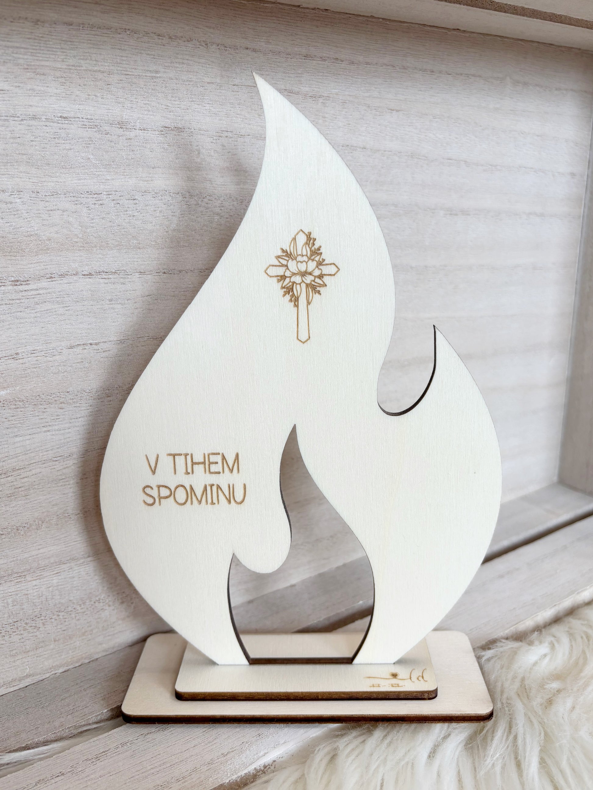 Leseni plamen je lep in trajen spominski okras. Na voljo je v različnih motivih in ga lahko personaliziramo z napisom po vaši želji. Izdelan je iz kakovostnega lesa in v primernih vremenskih pogojih ohrani svojo lepoto do več tednov.