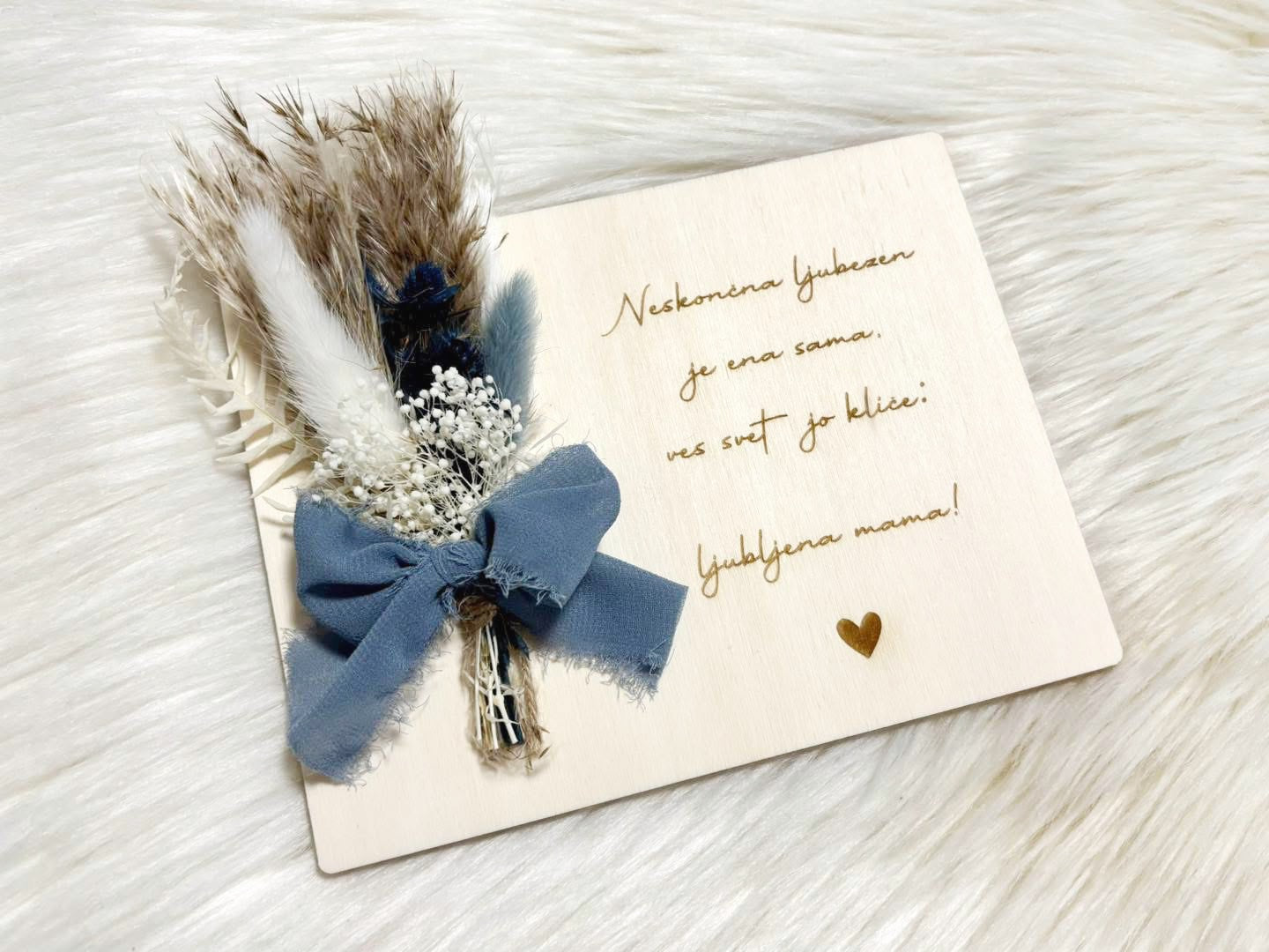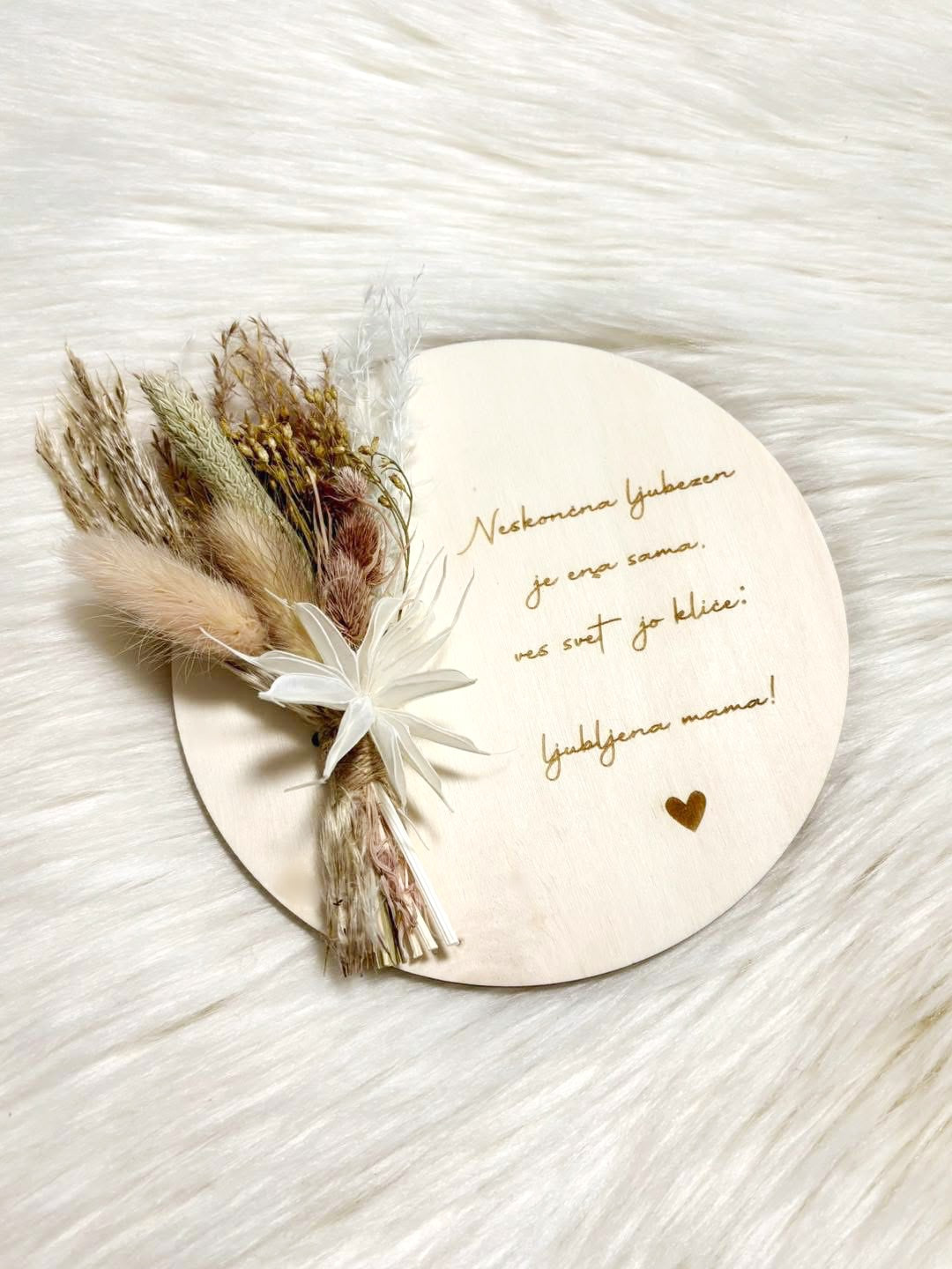 Posebna lesena tablica, ustvarjena za mamo. Naravni les v kombinaciji z izbranim suhim šopkom in čudovitim verzom ustvari darilo, ki pove več kot tisoč besed. Tablica je popolno darilo za materinski dan, dan žena, rojstni dan ali kot drobna pozornost, s katero mami poveš, kako zelo jo ceniš.