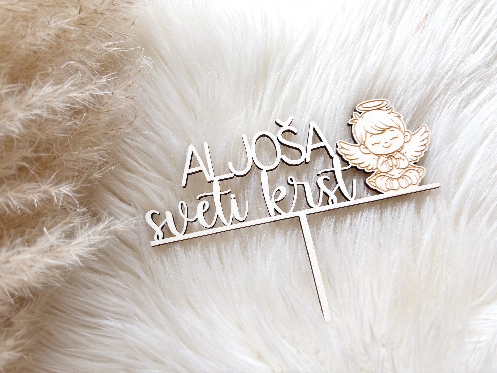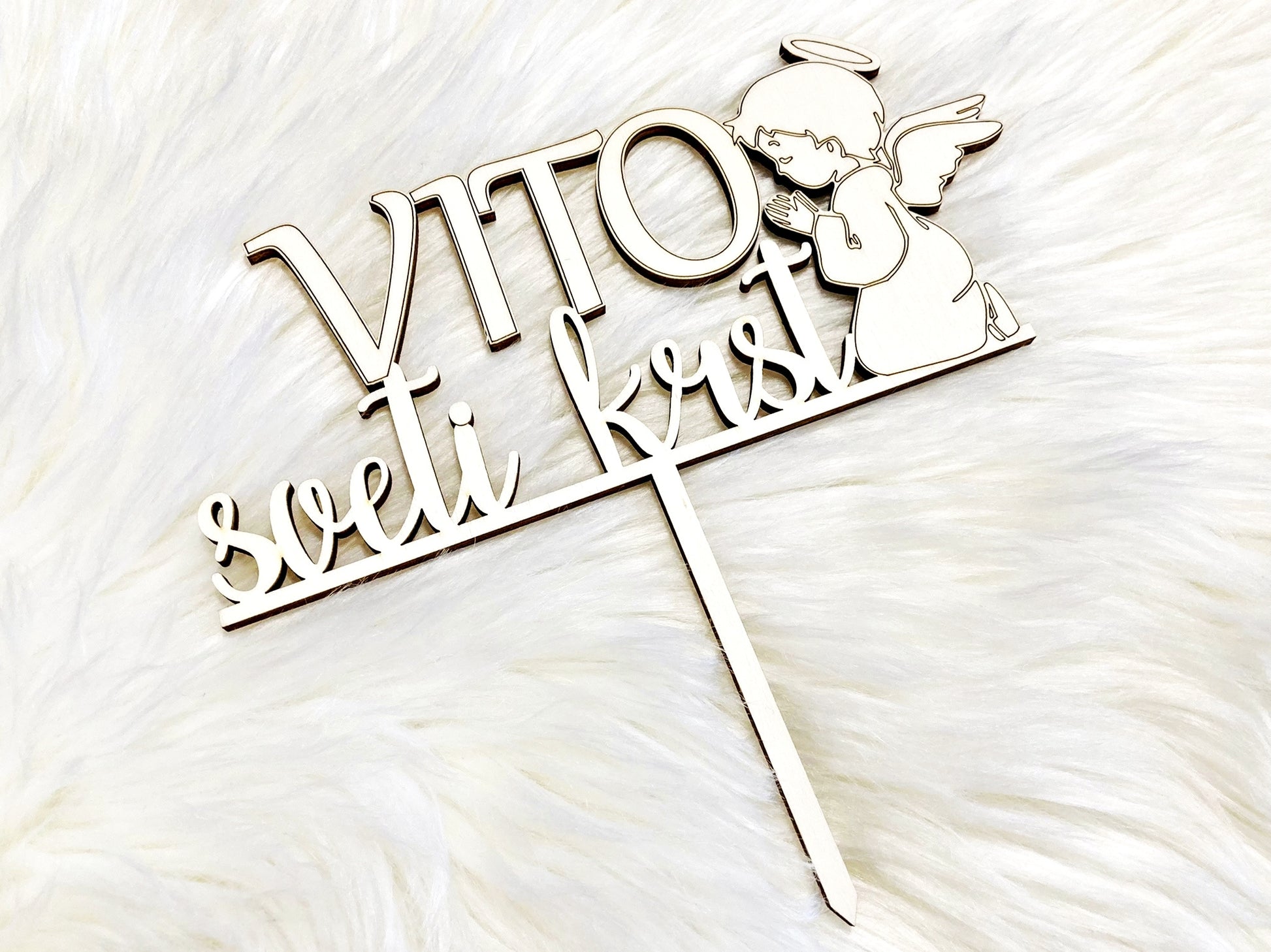 Nežen cake topper z motivom angelčka je popoln dodatek k torti ob praznovanju. Primeren je za vse vrste zakramentov ter za oba spola.