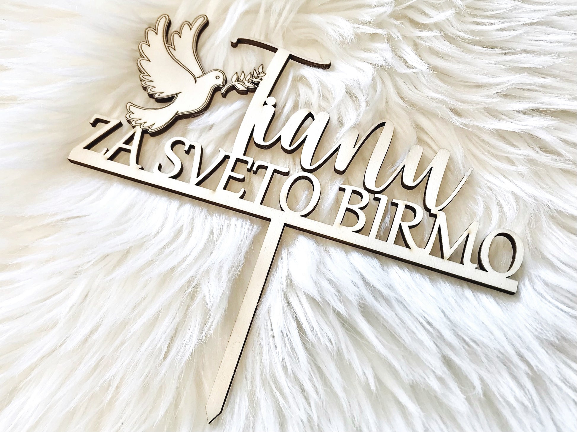 Elegantni cake topper za sveto birmo z motivom goloba je popoln dodatek k slavnostni torti. Izdelan z natančnostjo in ljubeznijo, simbolizira čistost, vero in praznično veselje.