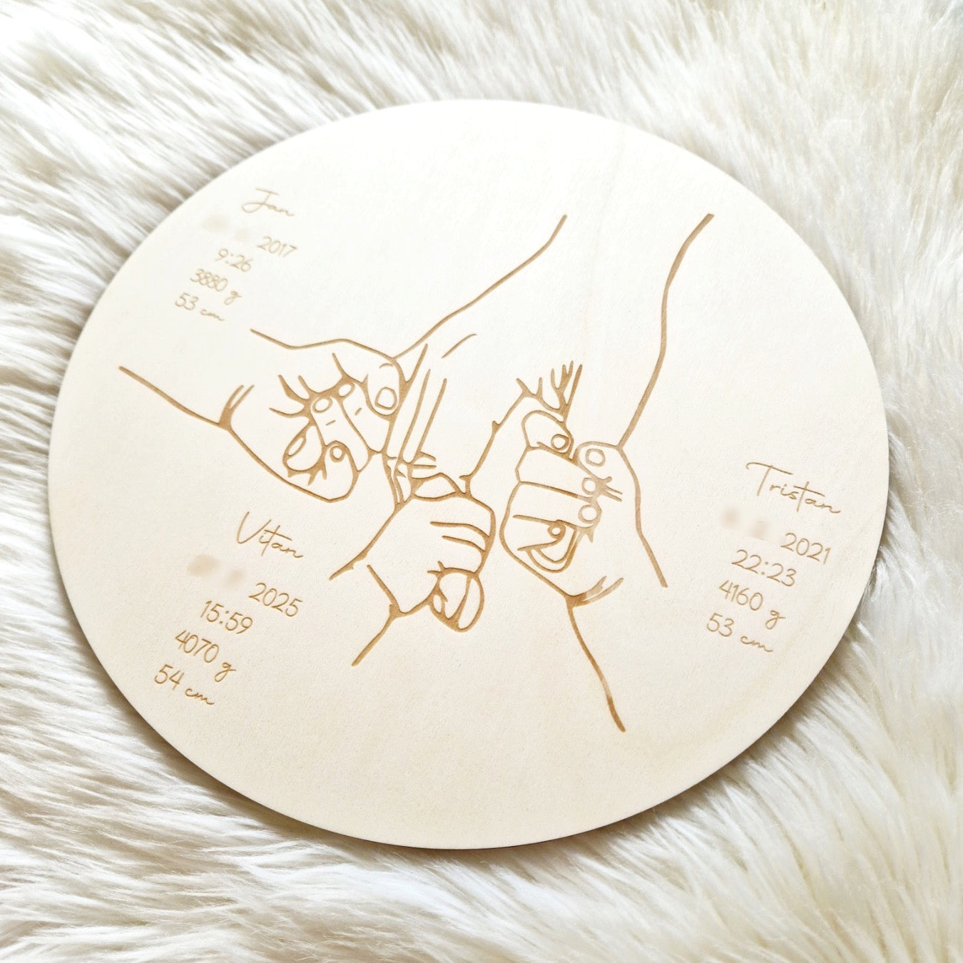 Odkrijte čarobnost družinske bližine v unikatni tablici z rojstnimi podatki otrok. Prikazuje mamino roko, ki drži svoje otroke, ob vsaki rokici pa so zapisani pomembni rojstni podatki – ime, datum, ura in teža. Tablica je prilagodljiva, kar pomeni, da lahko vključite poljubno število rokic.
