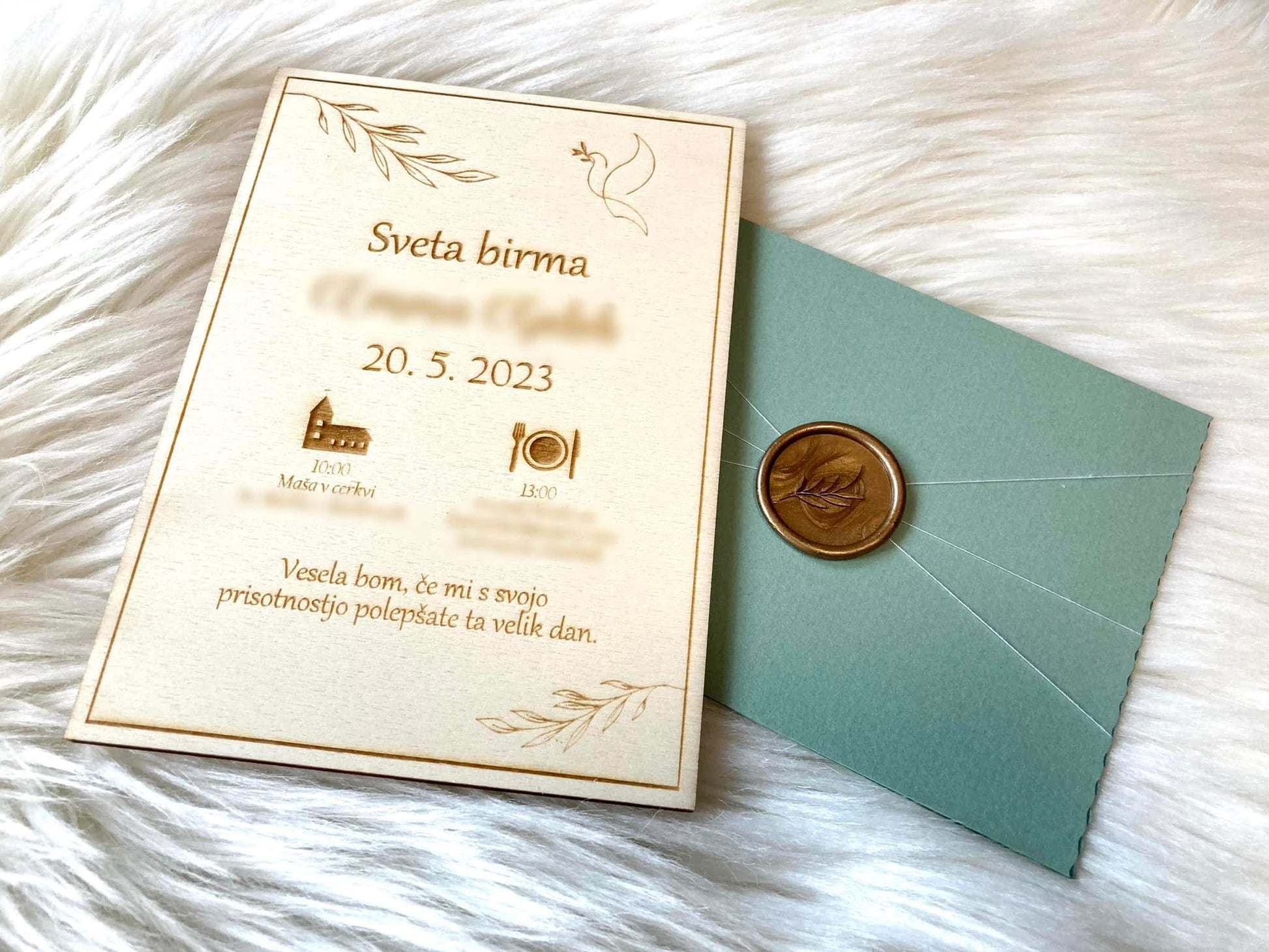 Elegantno vabilo za zakrament v pravokotni obliki (9 × 14 cm), oblikovano z nežnimi vejicami, ki simbolizirajo rast, čistost in nov začetek. Dizajn je preprost, a prefinjen, primeren za svečan in pomemben življenjski dogodek.