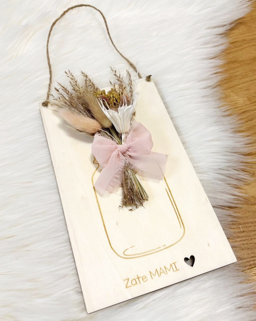 Nežna viseča tablica iz naravnega lesa s suhim šopkom in preprostim napisom za mamo. Minimalističen dizajn in naravni materiali ustvarjajo toplo sporočilo, ki ga mama začuti takoj, ko ga pogleda. Vsaka tablica je unikatna, saj se struktura lesa in suhi cvetovi med seboj razlikujejo. Čudovita pozornost za materinski dan, rojstni dan ali kar tako, iz srca.
