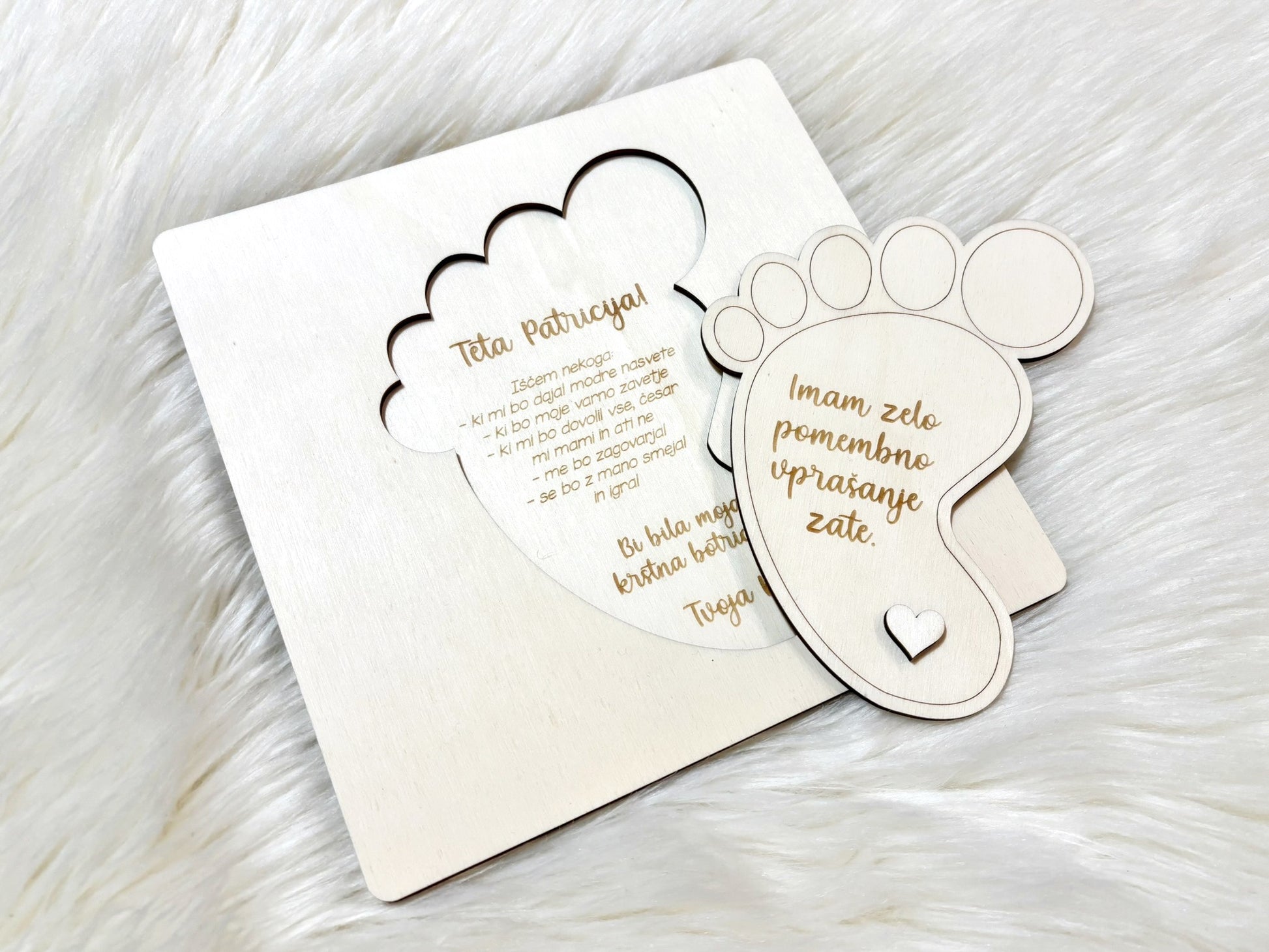 Lesena prošnja, ki na poseben način ohrani spomin na trenutek, ko nekoga prosiš za vlogo botra. Gre za darilo s pomenom, ki bo ostalo za vedno.